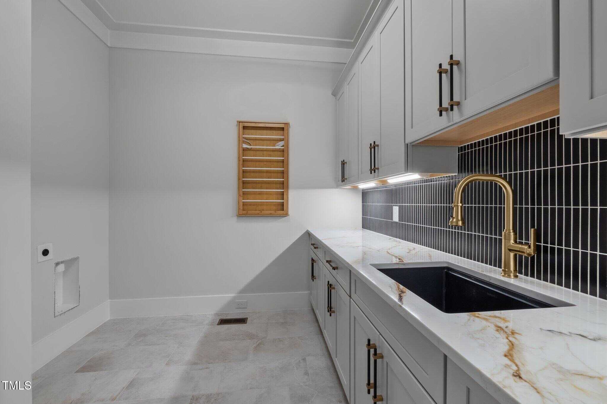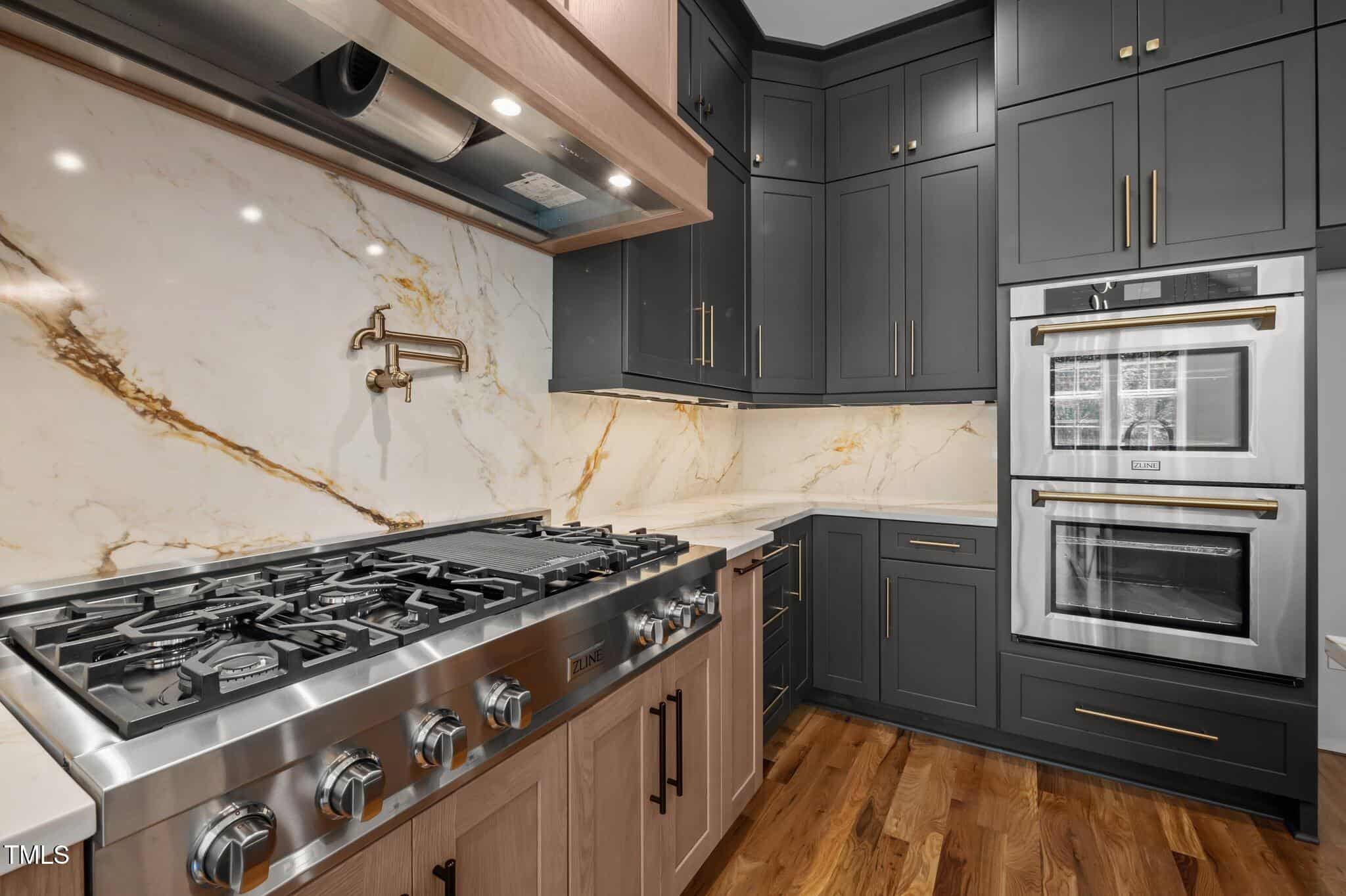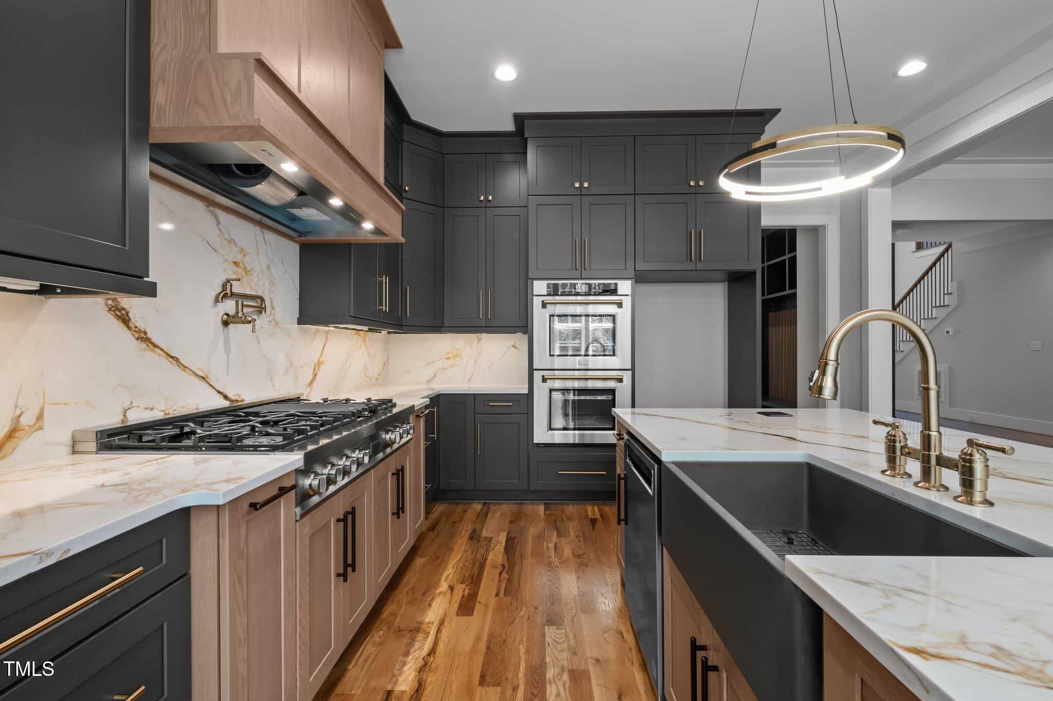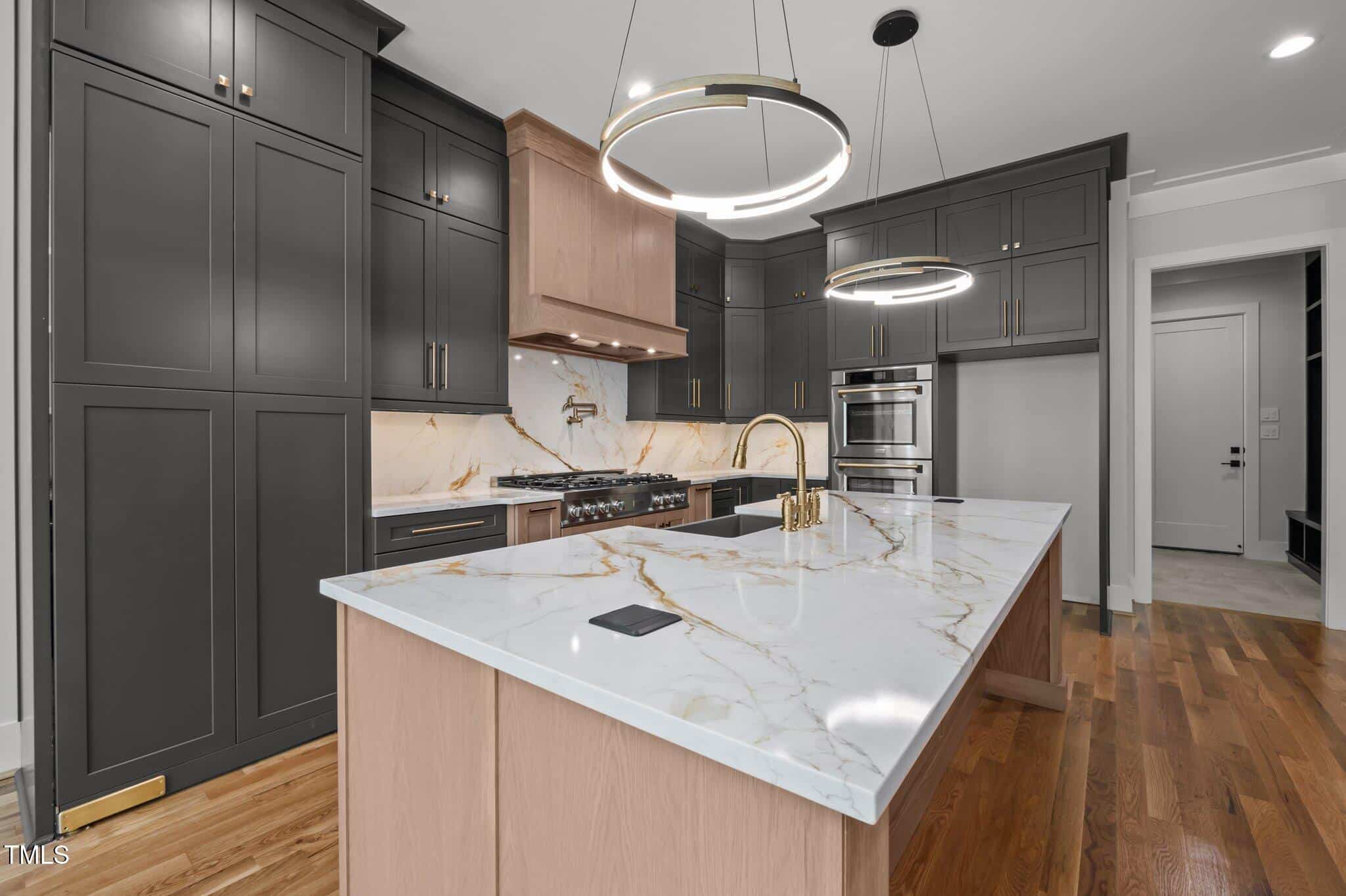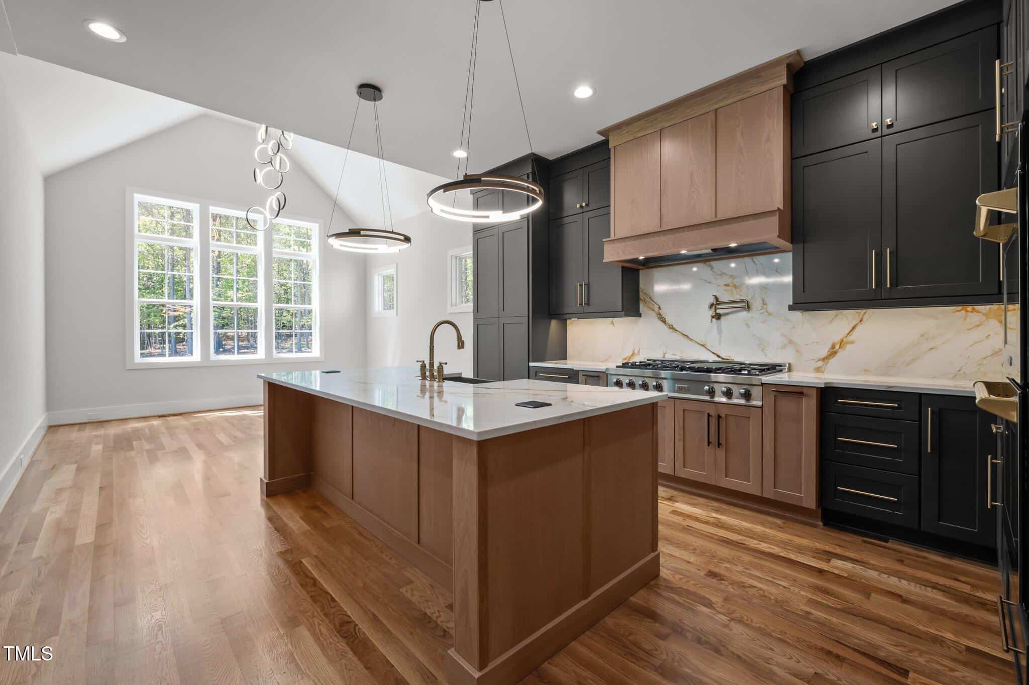 Kitchen: offers Quartz Countertops, Custom Painted Cabinetry, Under Cabinet Lighting, Designer Tile Backsplash, Large Painted Island w/Barstool Seating & Designer Pendants! SS Appls Incl Gas Cooktop, Microwave & Dishwasher & Oversized Scullery/Walk in Pantry! Opens to Vaulted Family Dining w/French Door to Rear Screened Porch!
