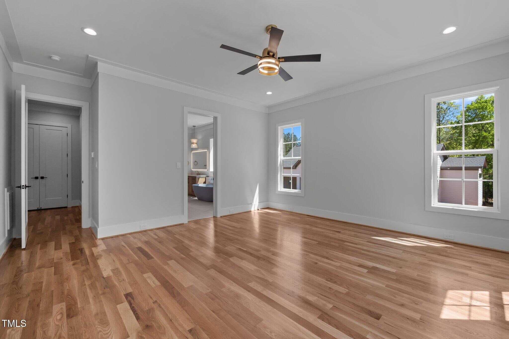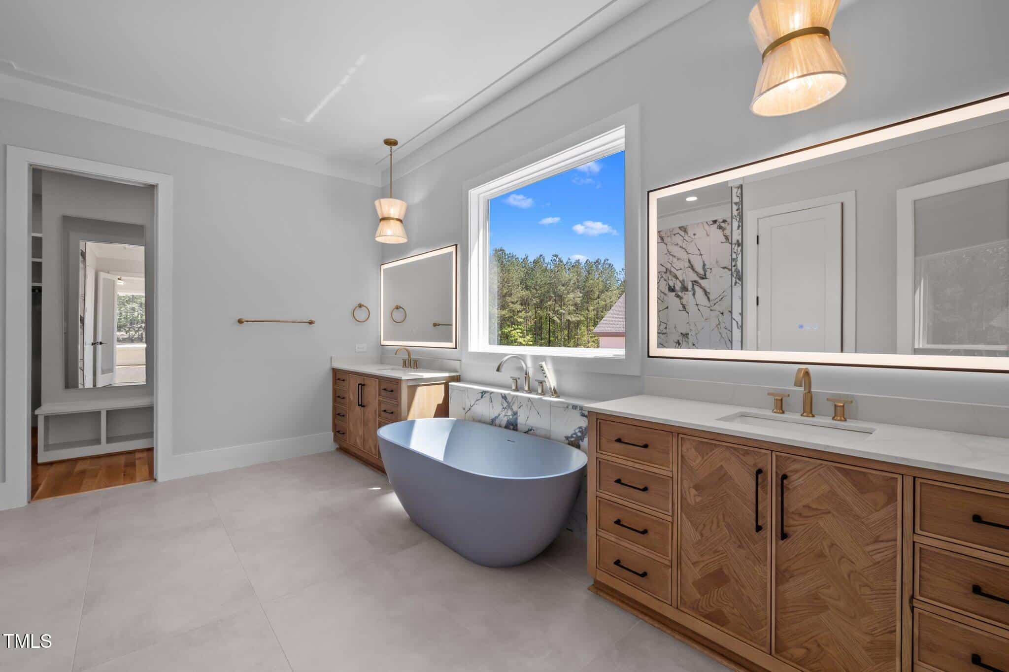 Main Level Primary Suite: features Hardwoods & Trey Ceiling! Owner’s Bath: Tile Flooring, Sep Custom Painted Vanities w/Quartz Tops, Spa Style Tile Surround Shower w/Bench Seat & Freestanding Tub! Huge Walk in Closet w/His & Her Sides!