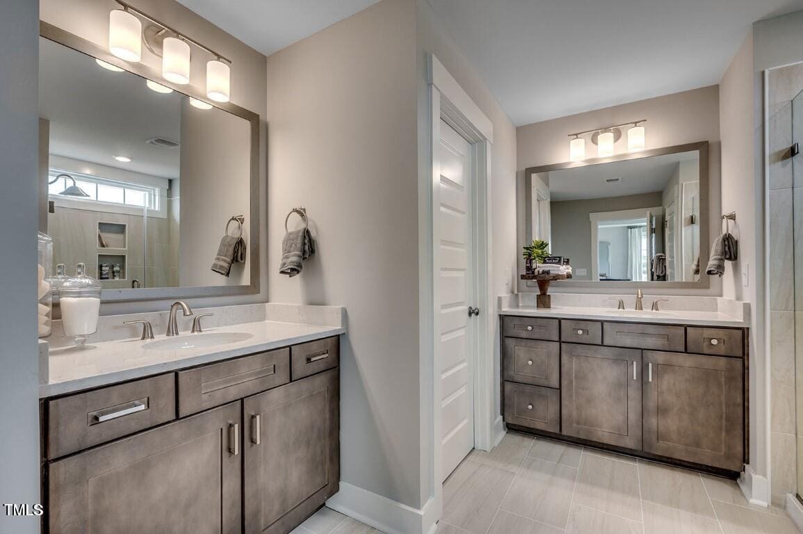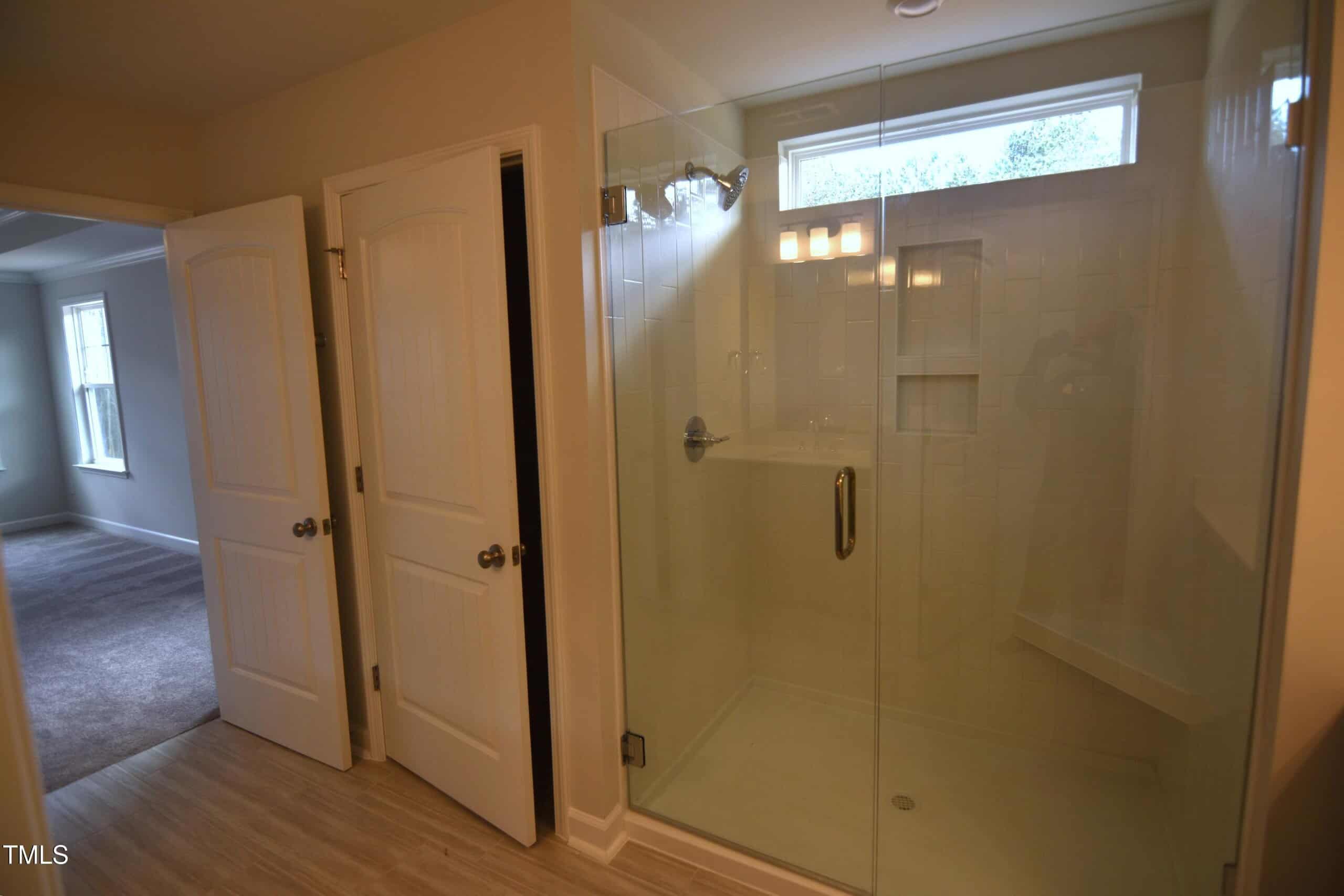 Primary Bath: 5′ Tiled Shower, Tile Floor, Custom Cabinets, Quartz CTop & Two Linen Closets!