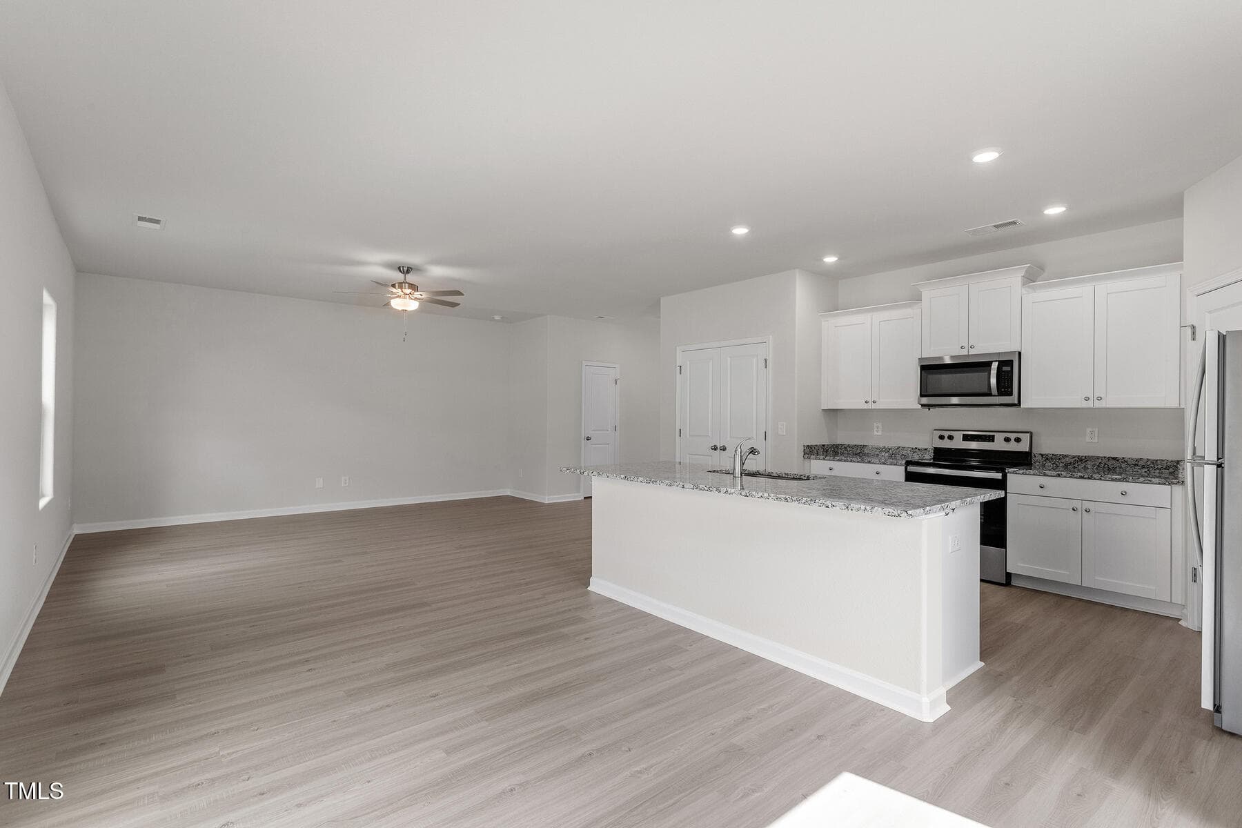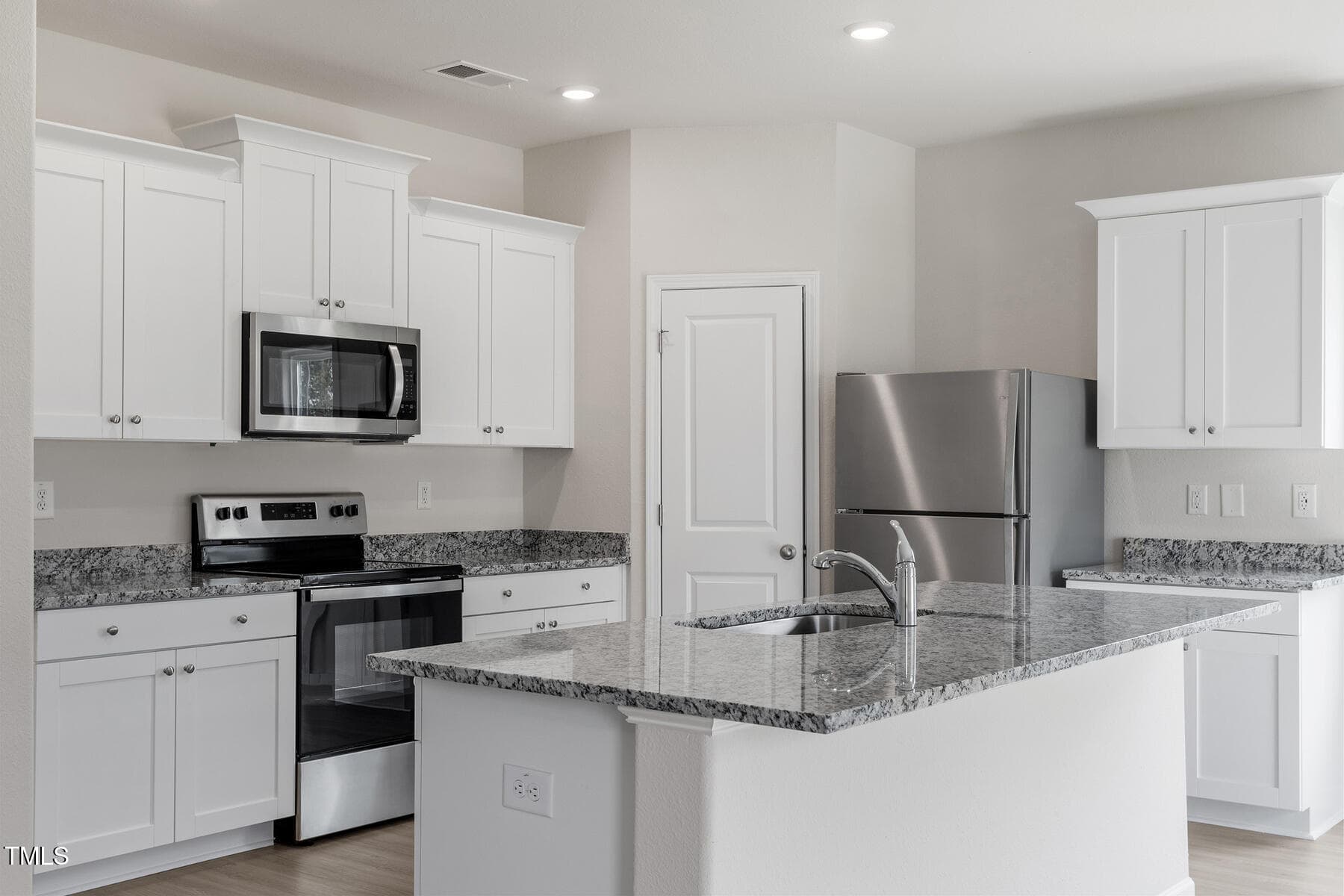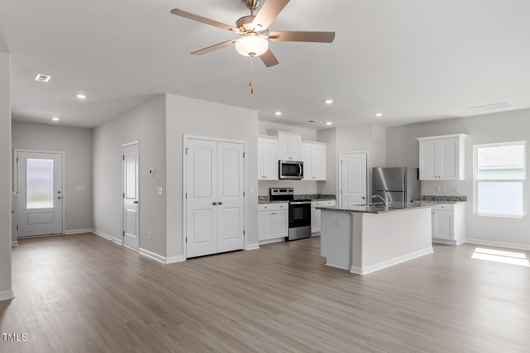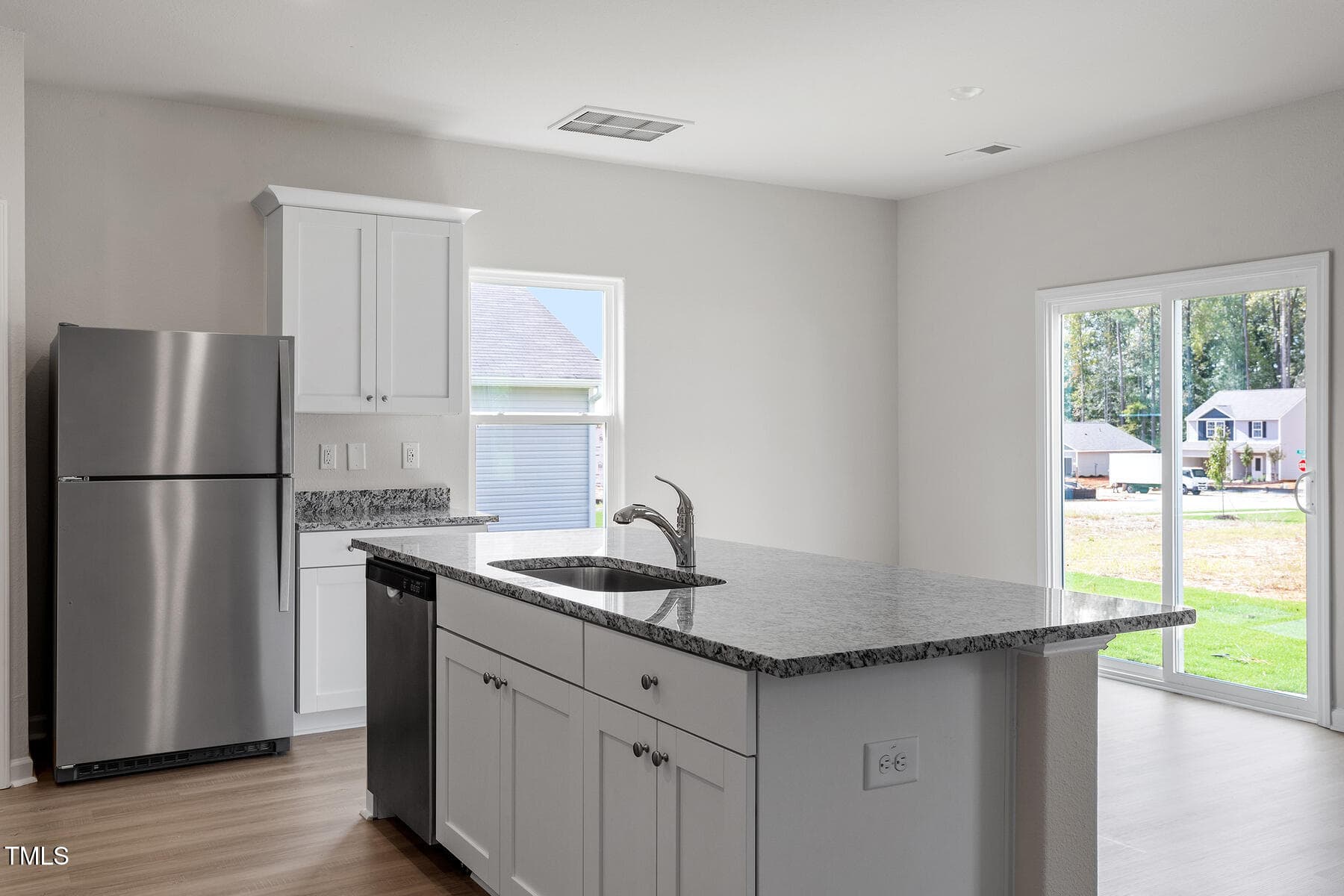 This 4-bed home Located on a beautiful corner lot has a spacious and airy feel that has been designed with your needs in mind. The large kitchen is open to the dining area and living room and has stainless steel appliances, gorgeous granite countertops, 36” upper cabinets with brushed nickel hardware and a large island.