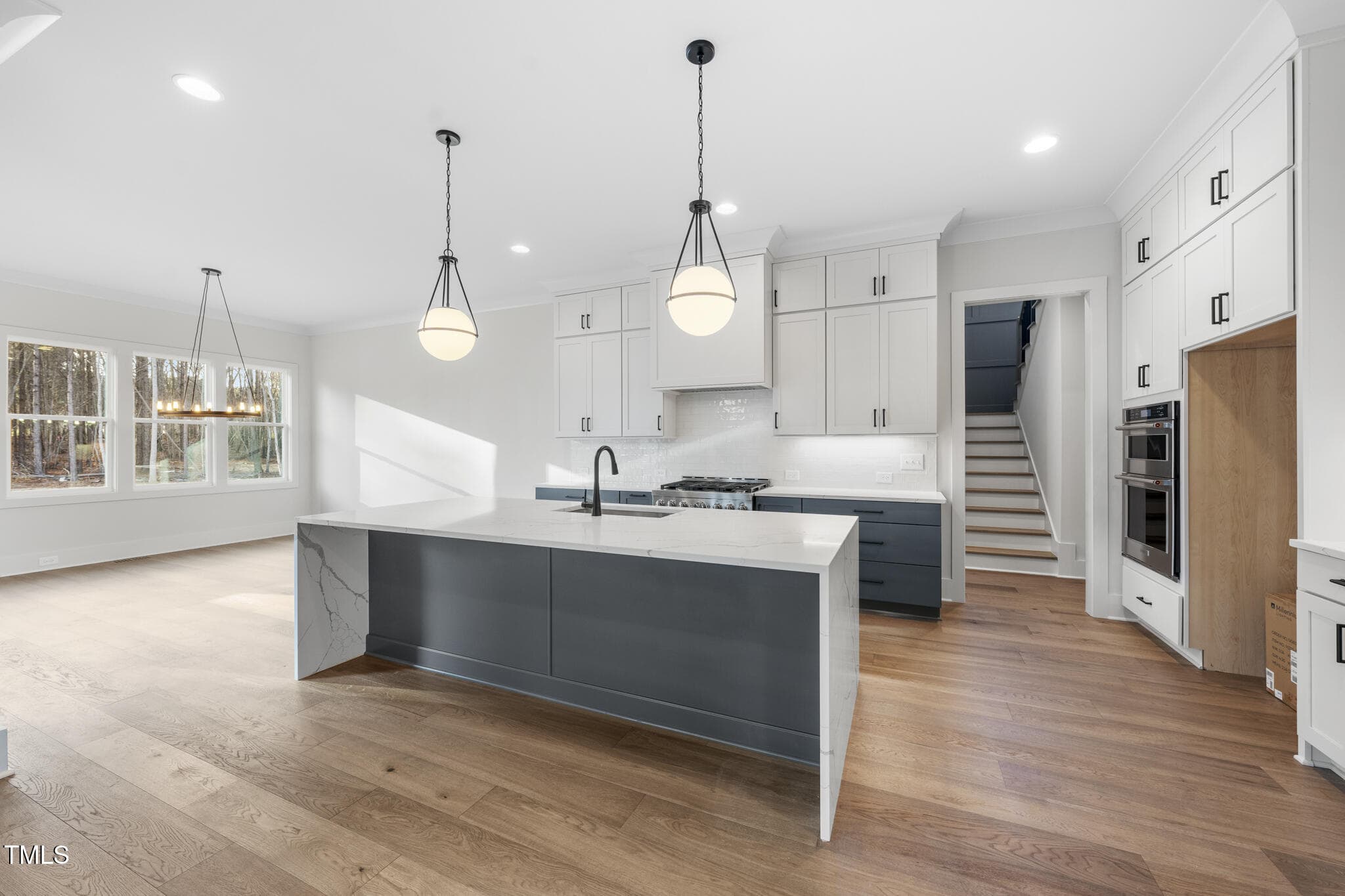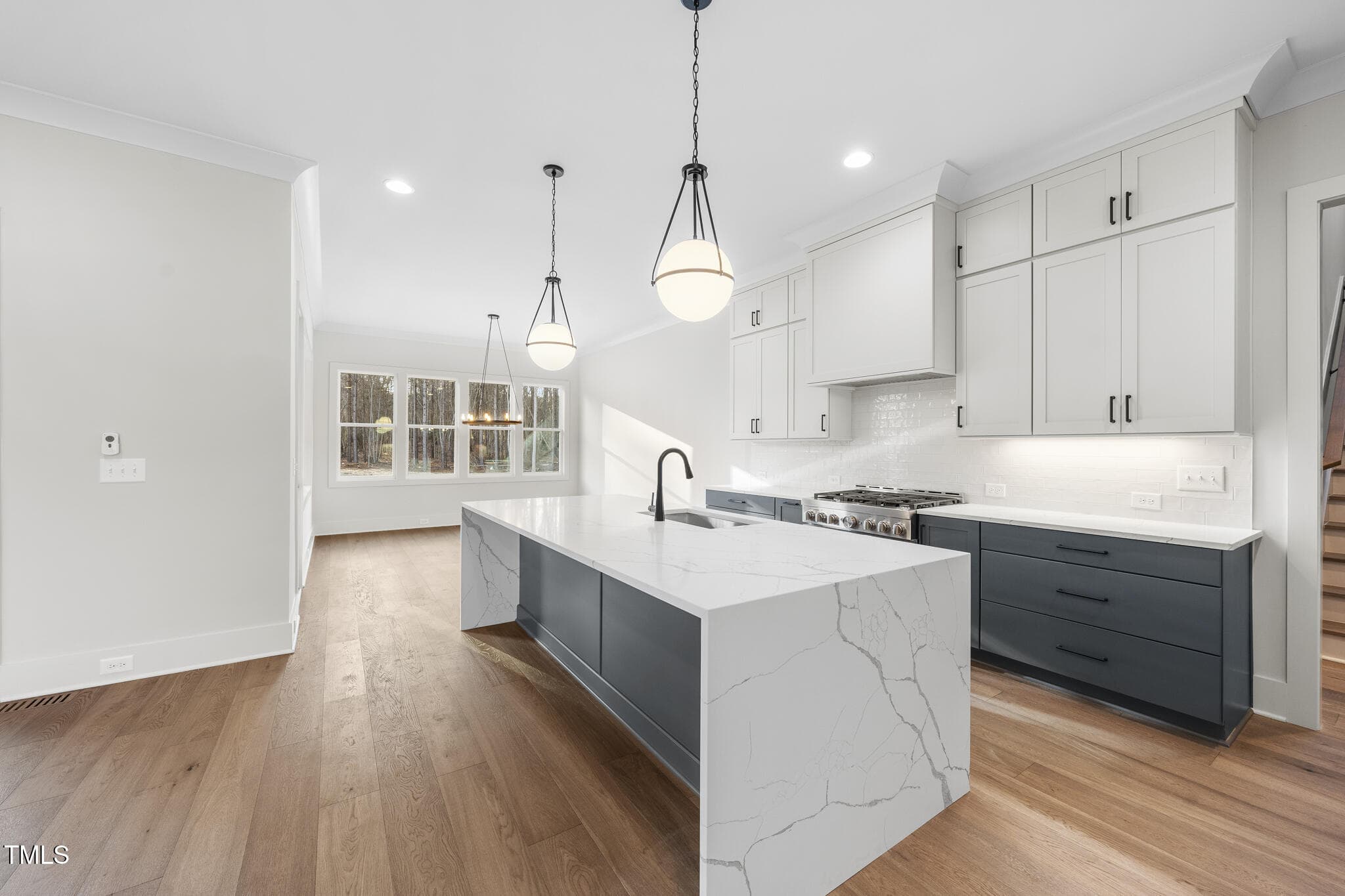 PRIVATE POOL READY LOT! Main Level Primary Suite, Guest, Study & 3 Car Garage! 10′ Ceilings & Wide Plank HWDs Throughout Main Living! Kitchen: Custom Painted Cabinets to Ceiling, Under Cabinet Lighting, Designer Tile Backsplash, Large Quartz Island w/Waterfall Edge & Designer Globe Pendants, Gourmet SS Appls Incl Gas Range & Hidden Walk in Pantry! Huge Informal Dining w/Tons of Natural Light!