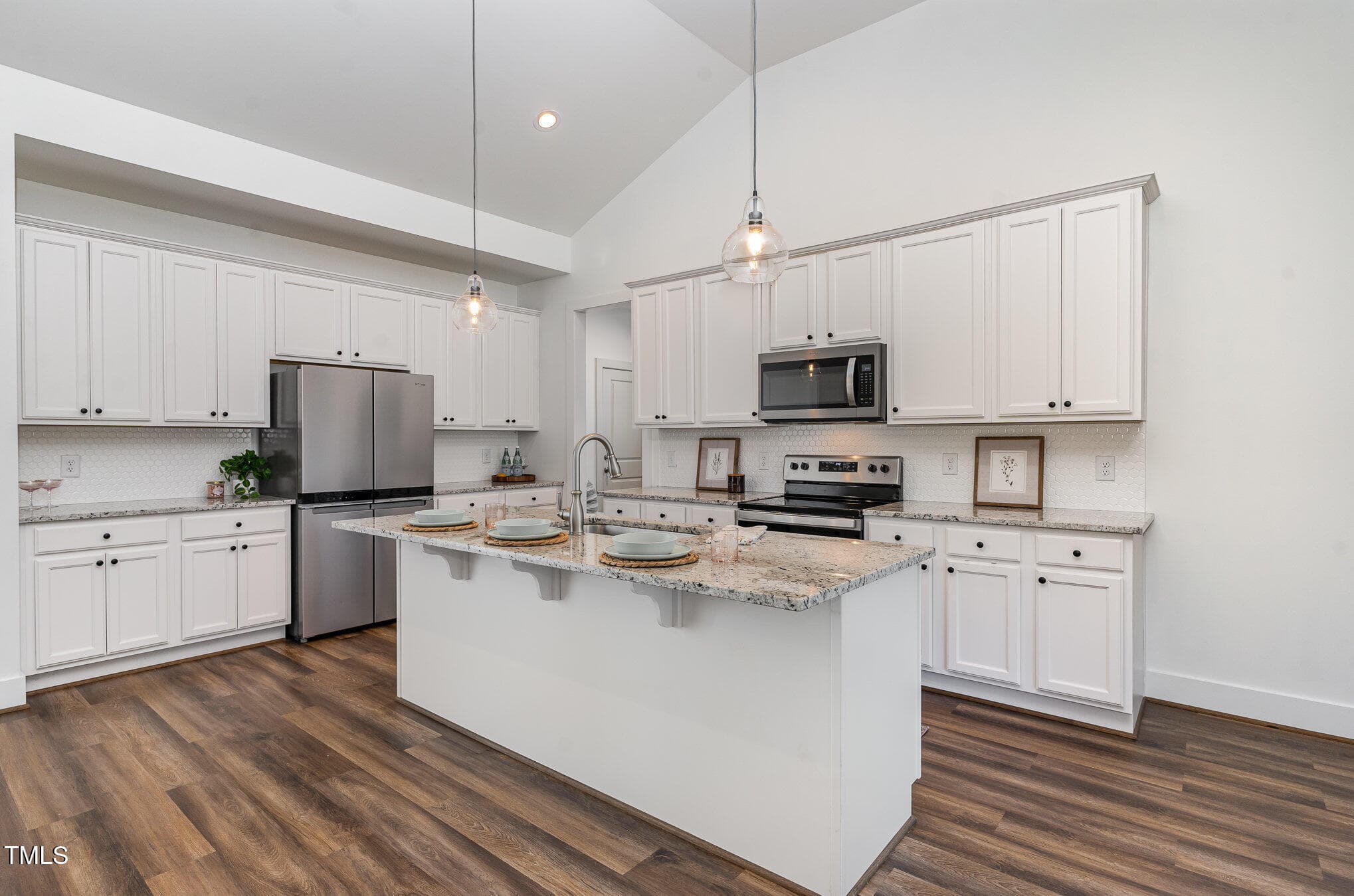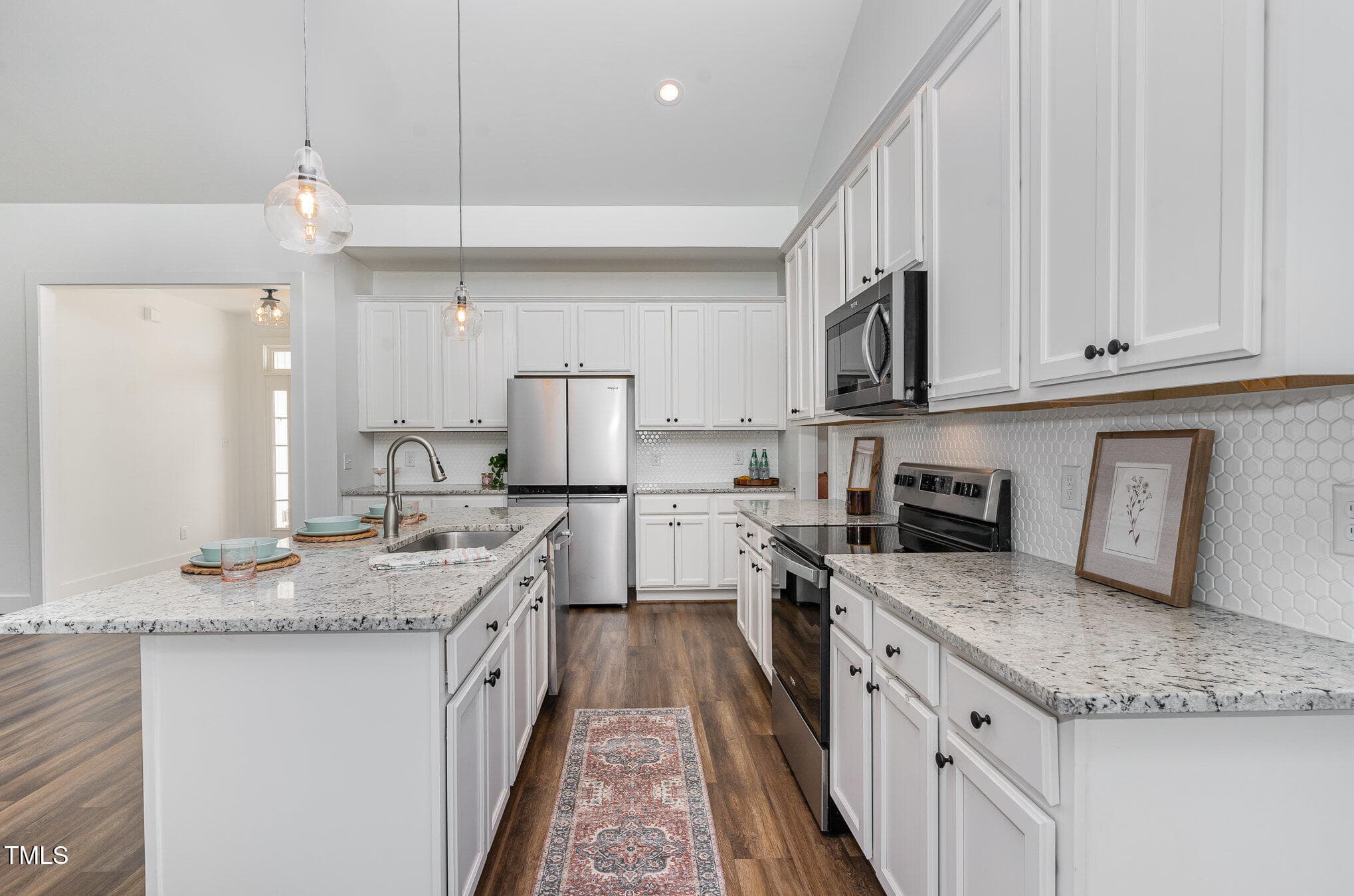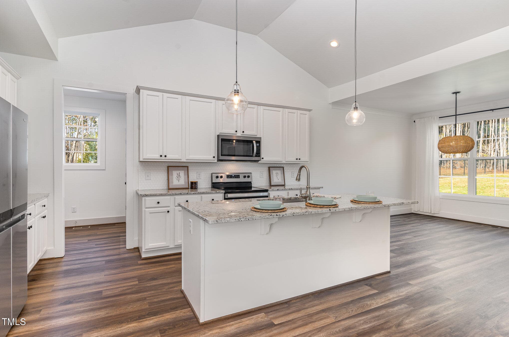 The kitchen, complete with stainless steel appliances, granite countertops, and tile backsplash, offers plenty of storage and functionality. The well-designed layout flows seamlessly into a new screened-in porch, where you can enjoy serene views of the spacious fully fenced backyard with raised beds ready for your spring gardening.