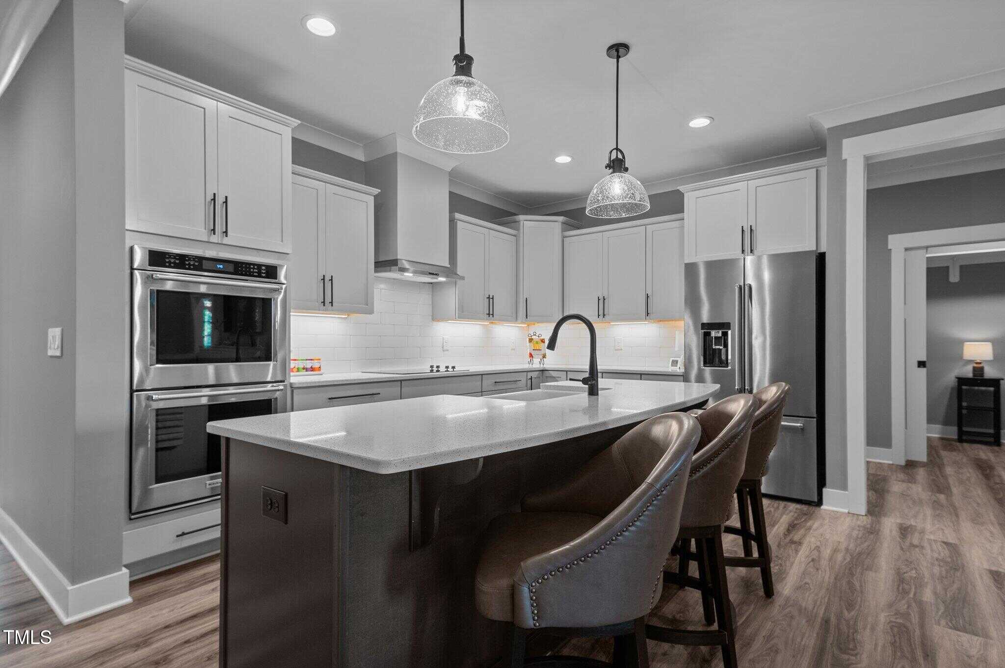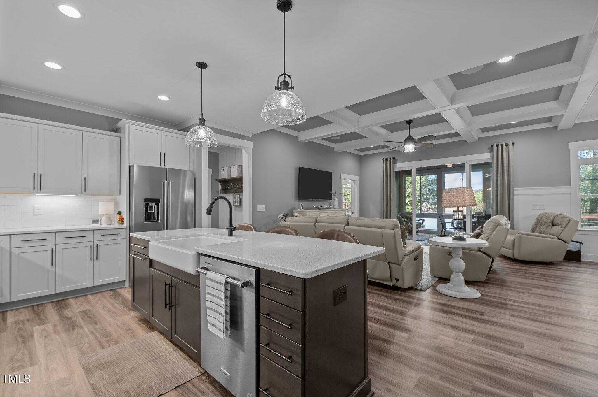 Step inside to find true one-level living with quality 2×6 construction and an open-concept layout designed for comfort, elegance, and flow. The heart of the home is a beautifully appointed kitchen featuring high-end KitchenAid appliances, custom cabinetry, and a large center island perfect for gathering. A thoughtfully placed laundry room with Miele washer and dryer adds to the everyday convenience.