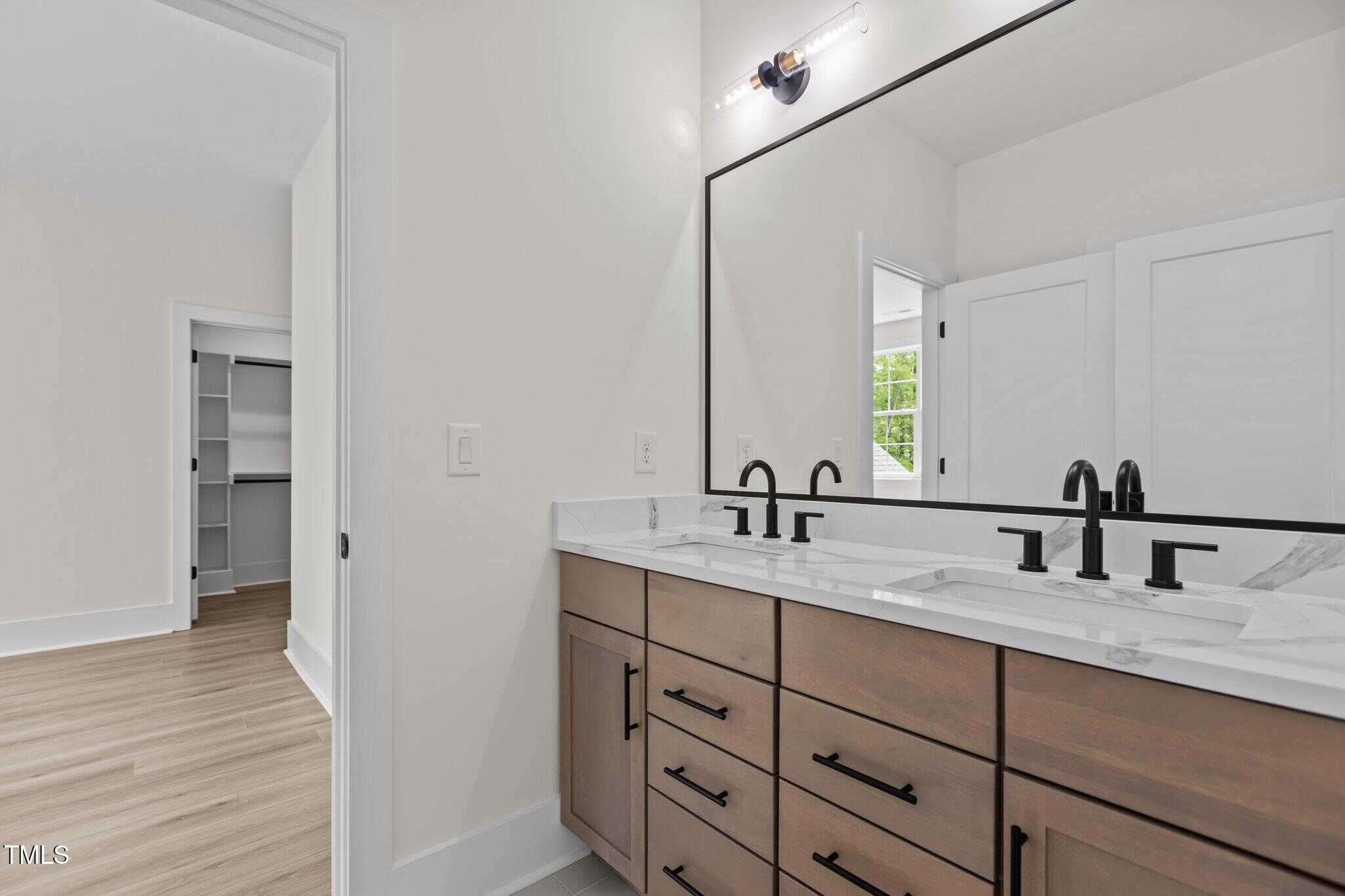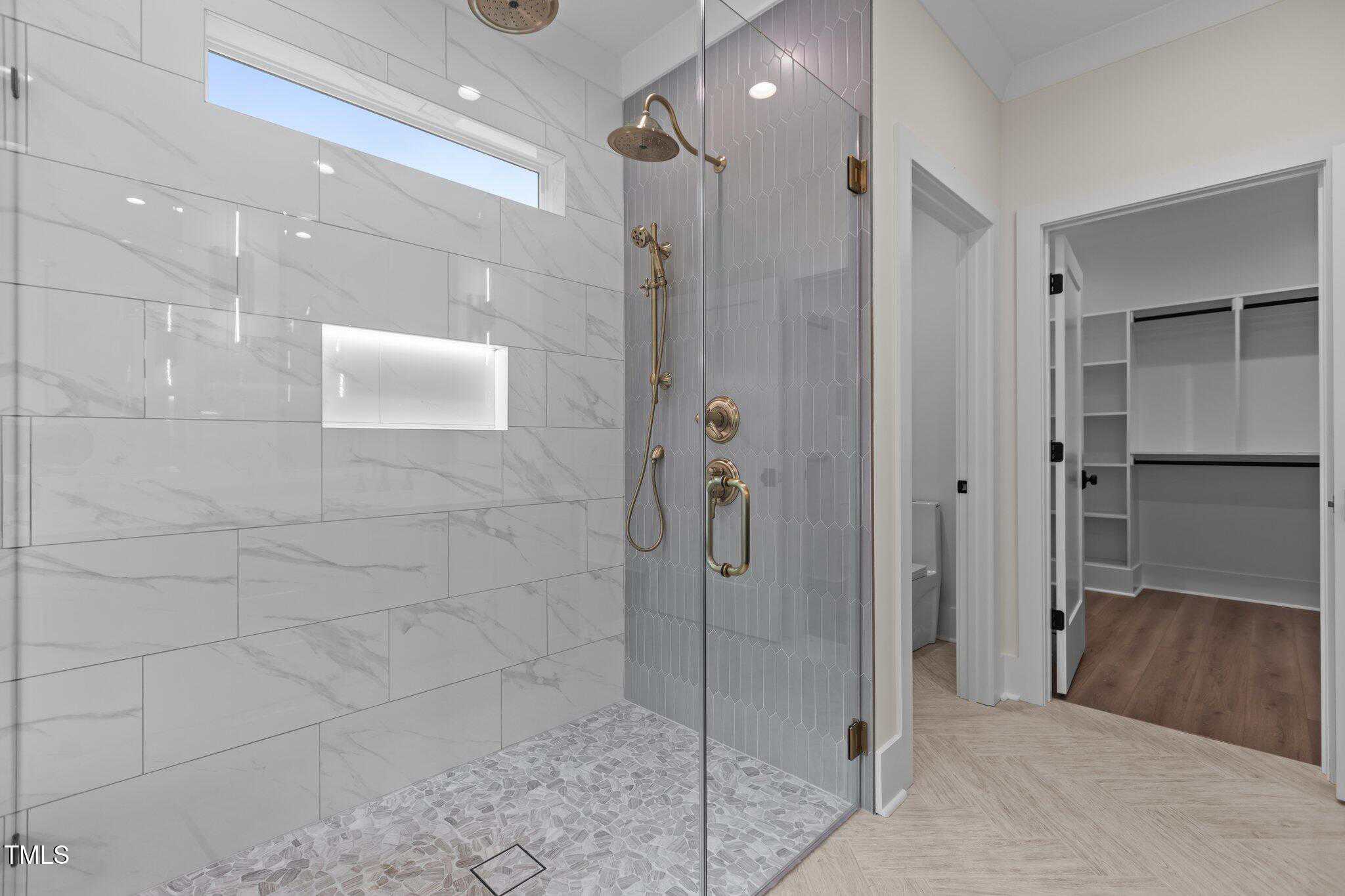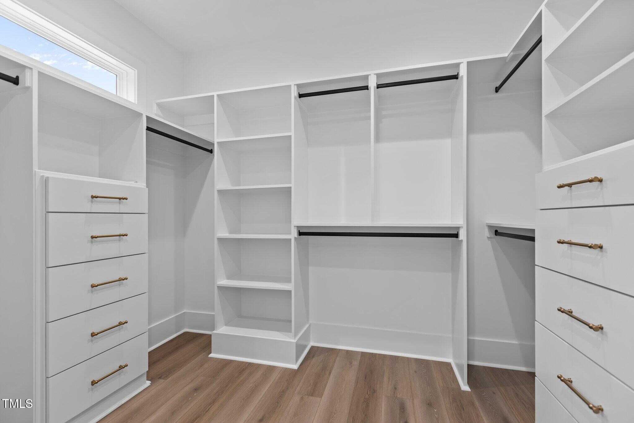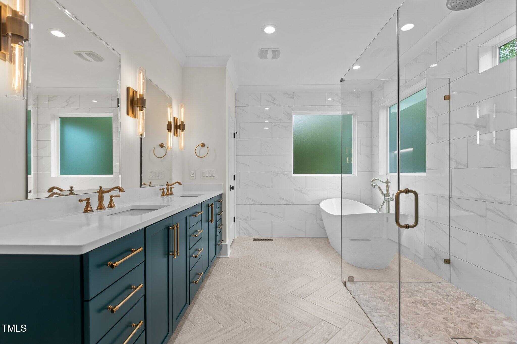 Owner’s Bath: Dual Vanity, Custom Cabinets, Soaking Tub, Zero Entry Tile Surround Walk in Shower w/Bench & WIC w/Custom Shelving!