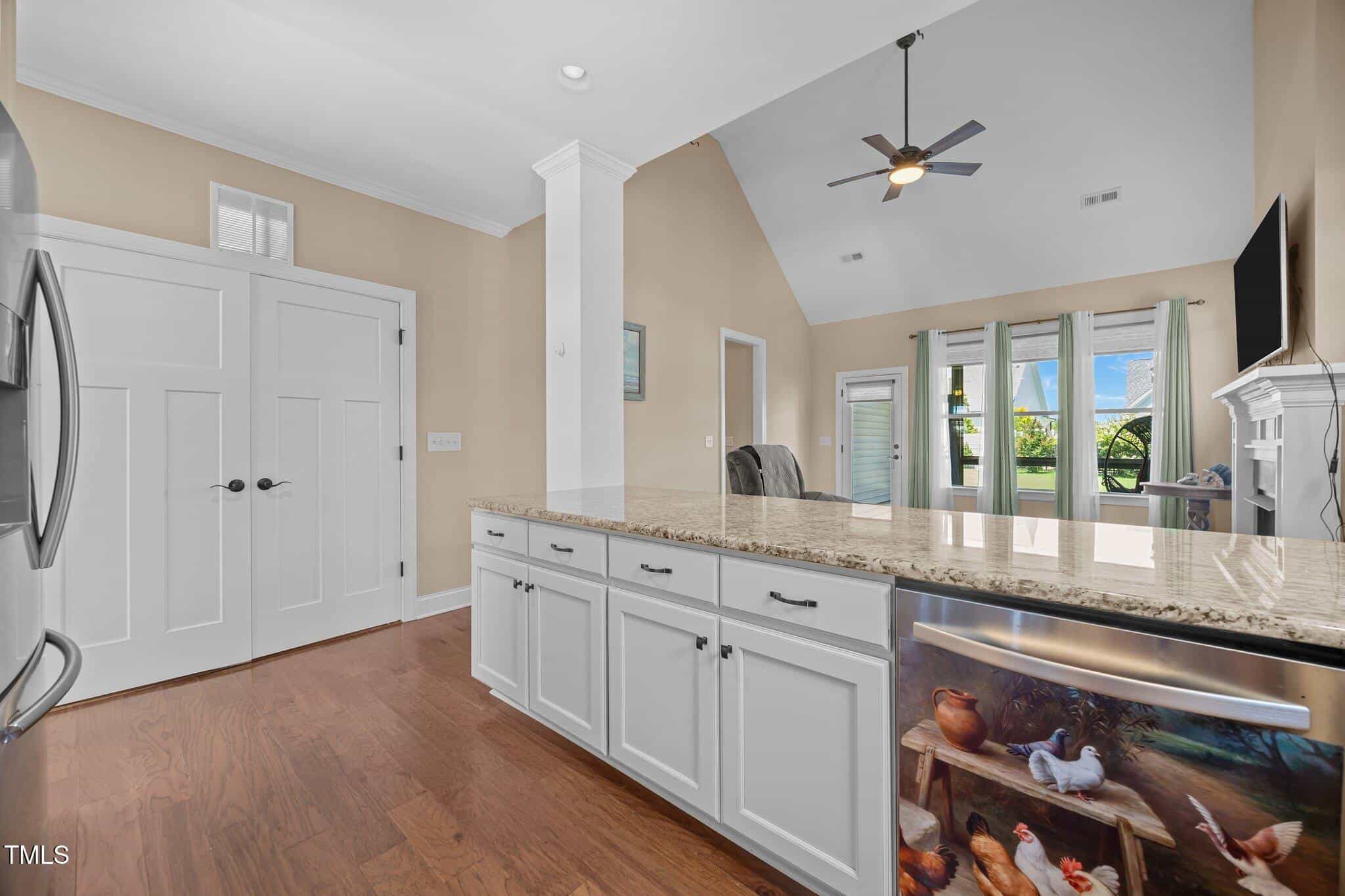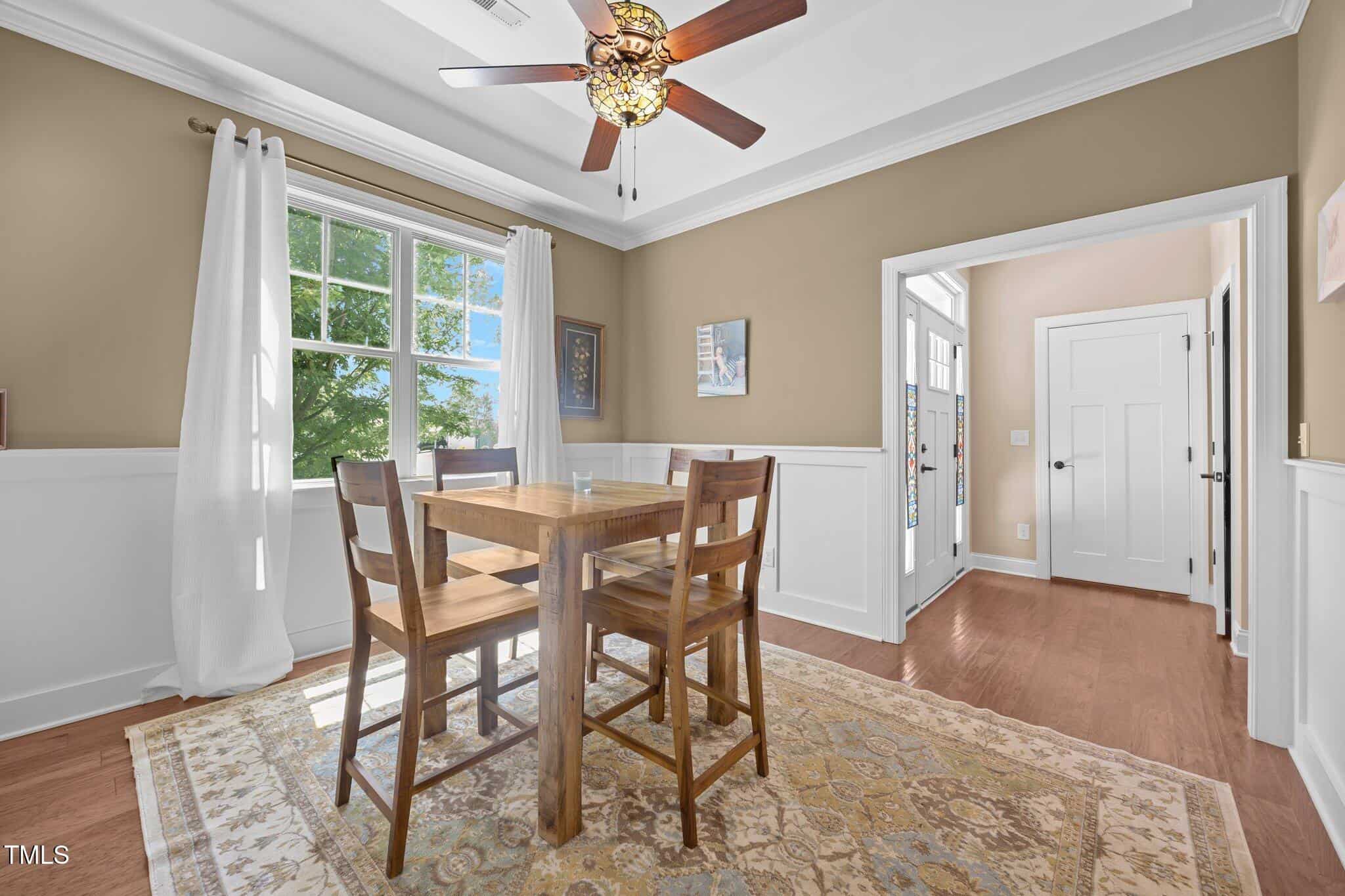 Entertaining is a dream with the expansive granite countertop where guests can be both in the living room and hanging out with the chef simultaneously! Enjoy the beautiful stainless steel appliances and cooking on an induction range. The dining room is a beautiful space with its tray ceiling and custom wainscoting. Every meal is special in this intimate, beautiful room. Gorgeous hardwood floors flow seamlessly from front door to the back door/screened porch.