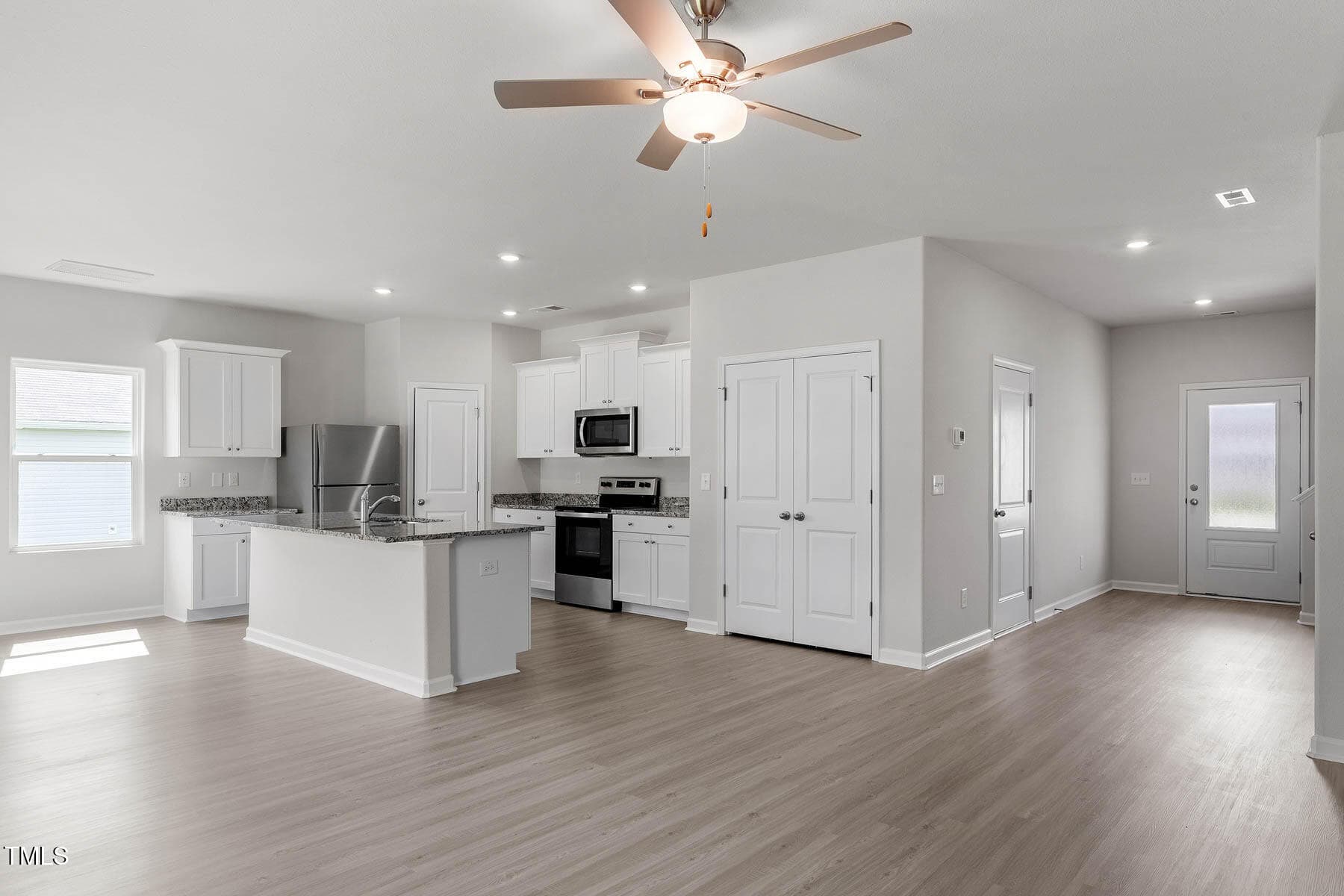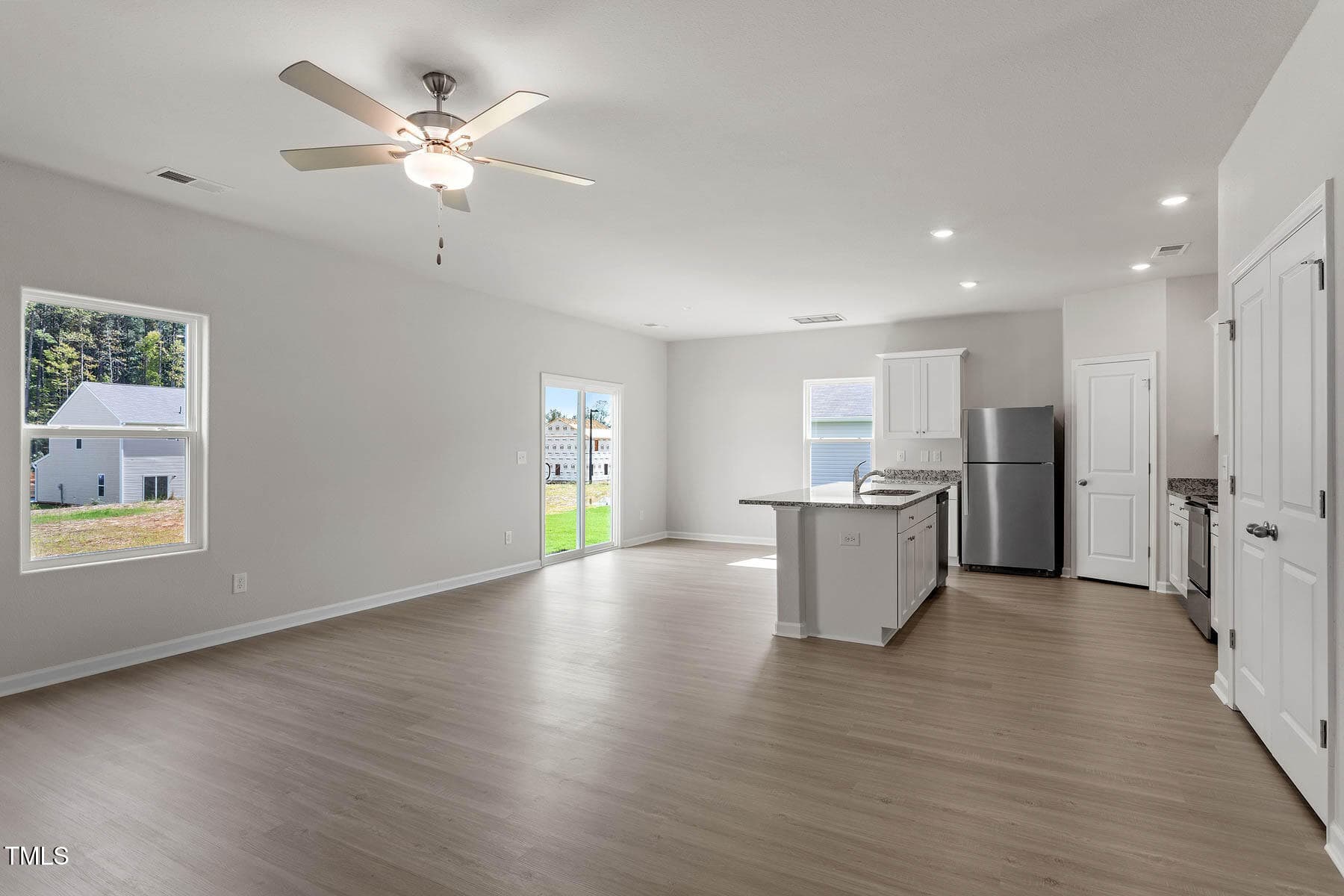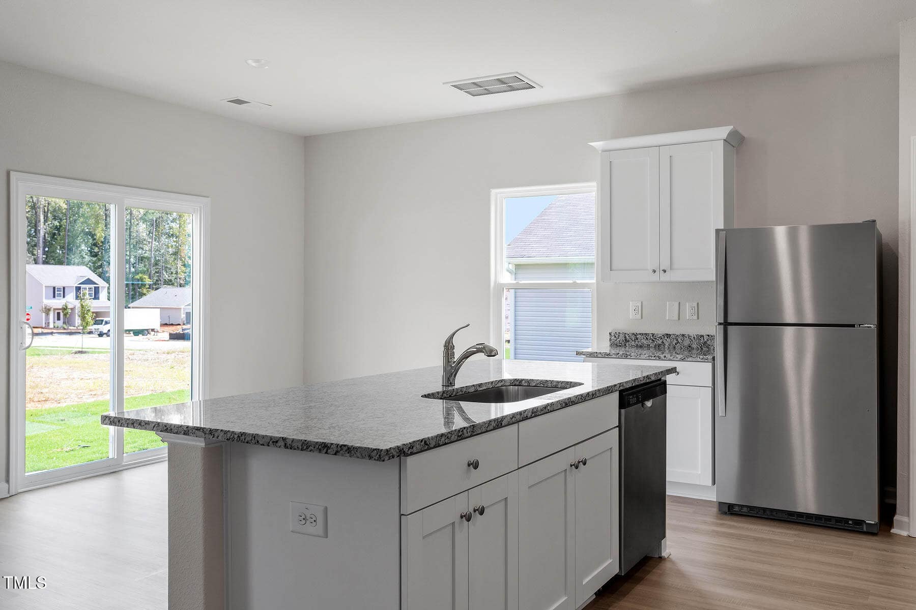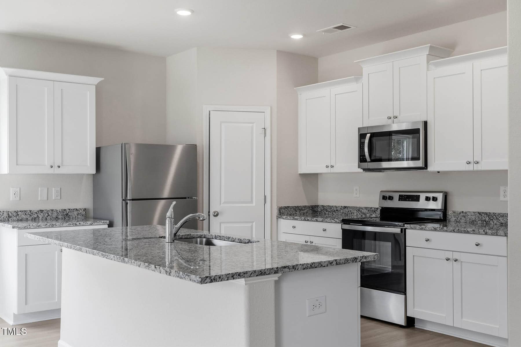 This 4-bed home Located on a beautiful corner lot has a spacious and airy feel that has been designed with your needs in mind. The large kitchen is open to the dining area and living room and has stainless steel appliances, gorgeous granite countertops, 36” upper cabinets with brushed nickel hardware and a large island.