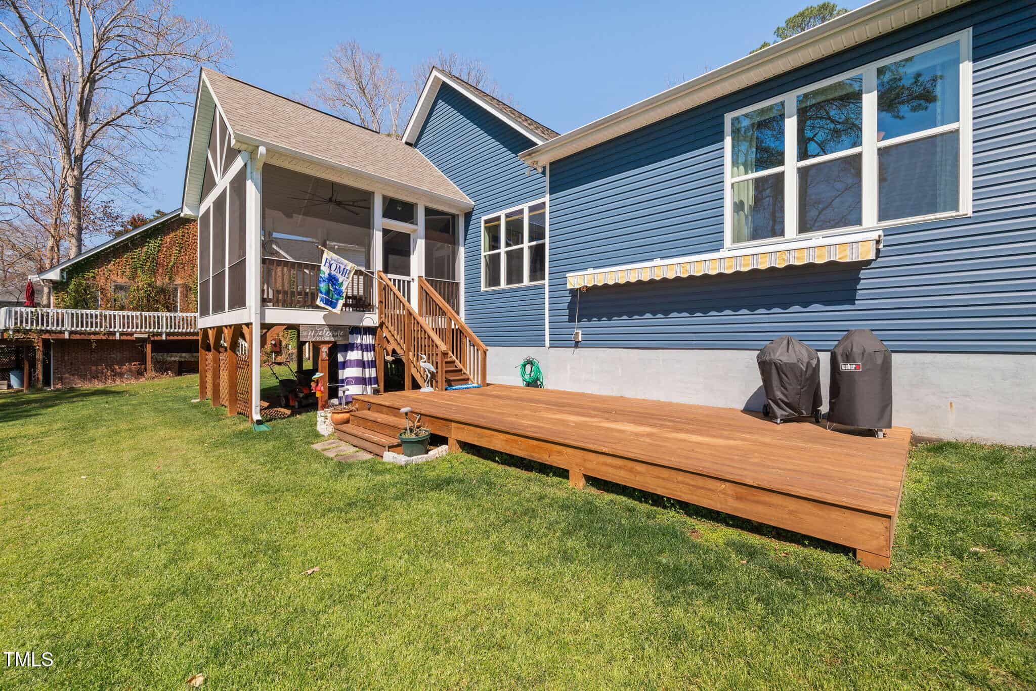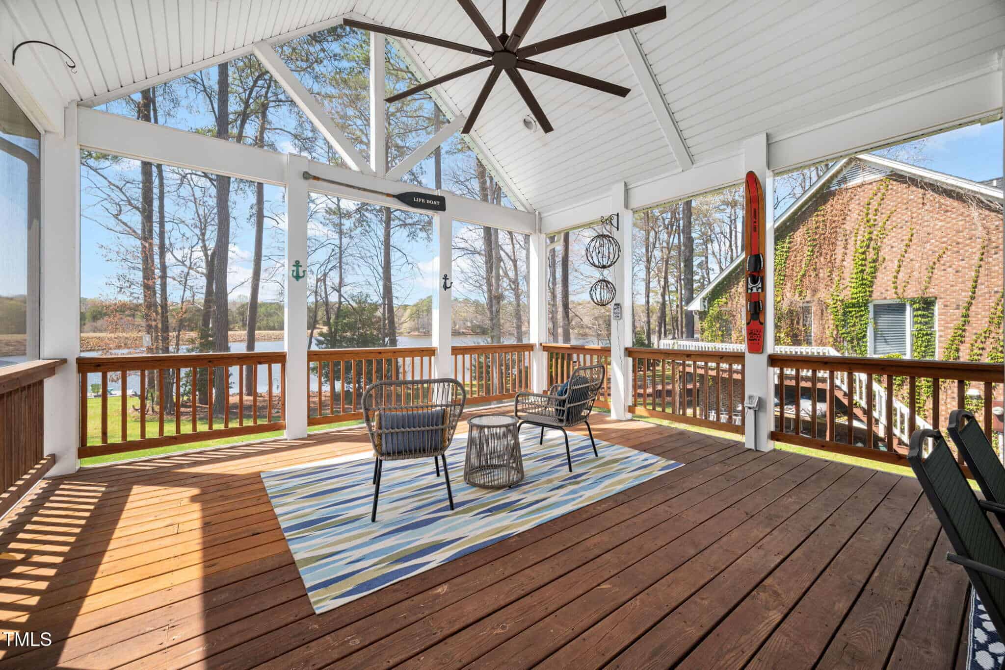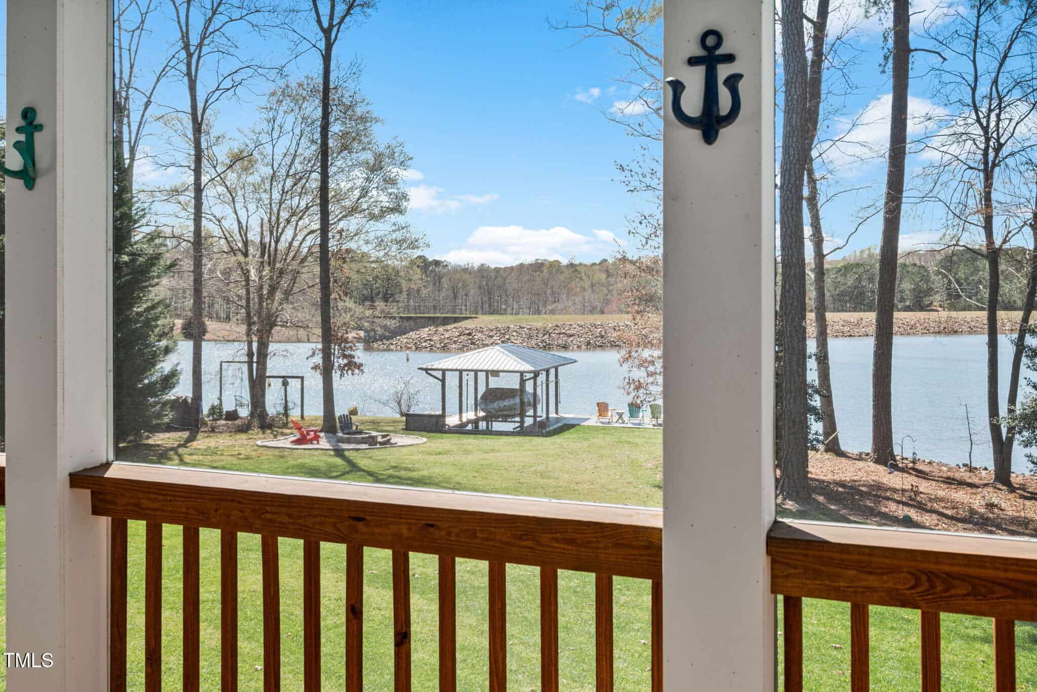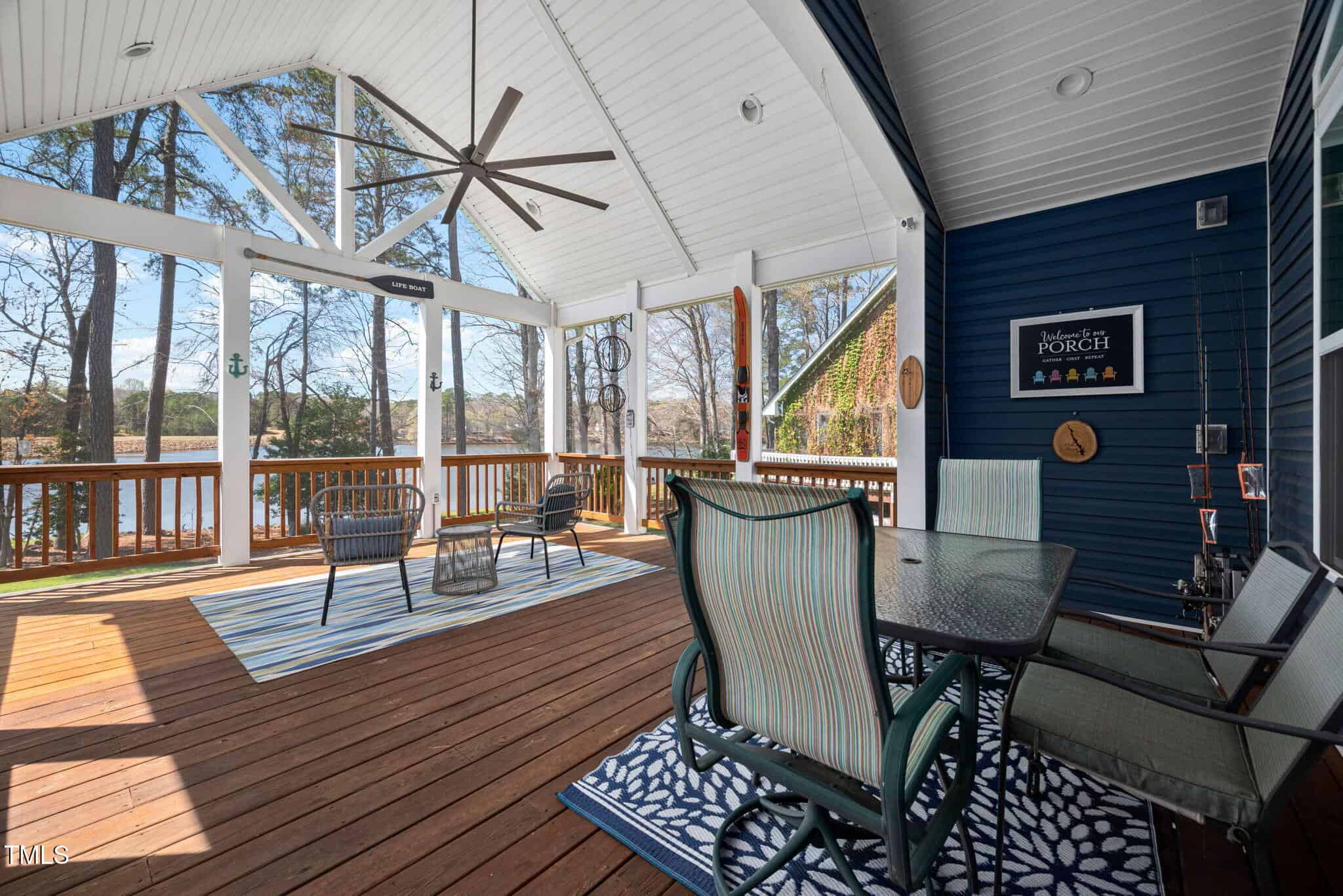 Inviting Outdoor Spaces: Cozy up by the outdoor fireplace or relax in the expansive, screened-in porch (installed in 2022) with panoramic views of the lake. Additional deck space with an automatic awning offers shade and comfort on sunny days.