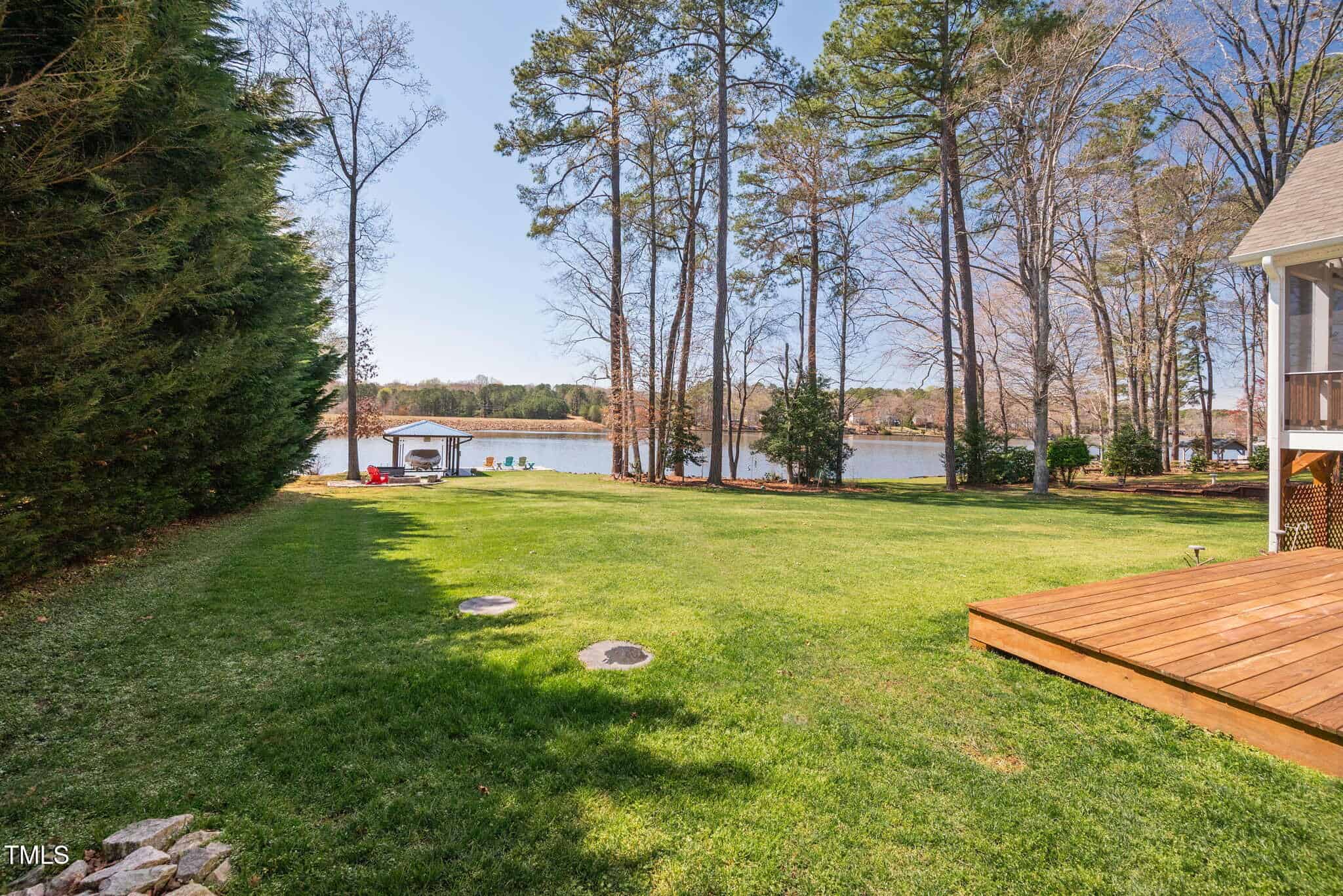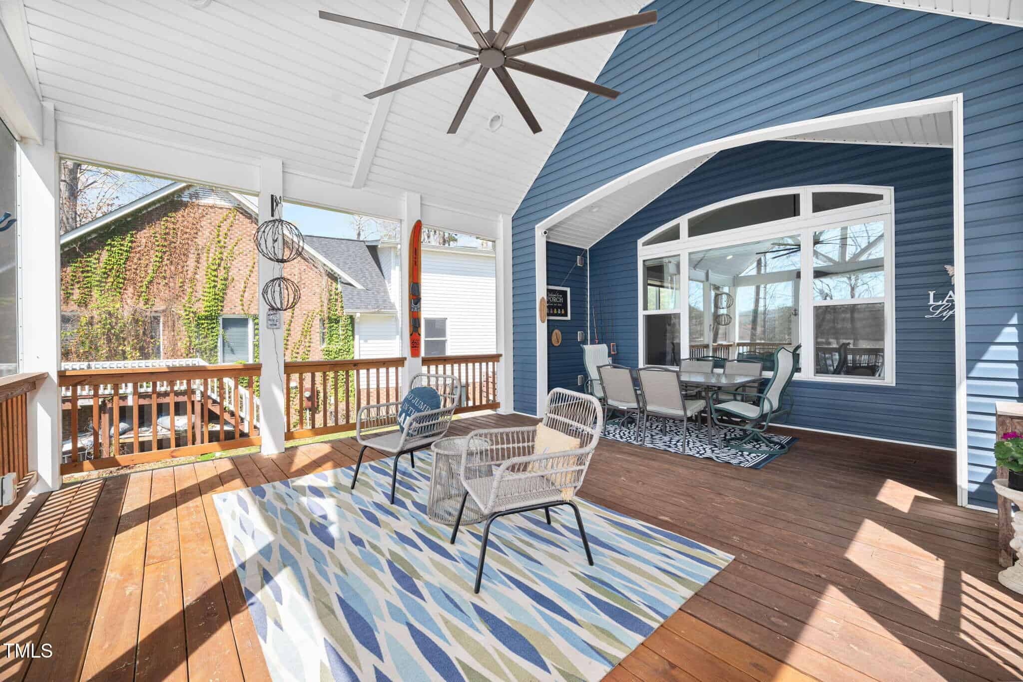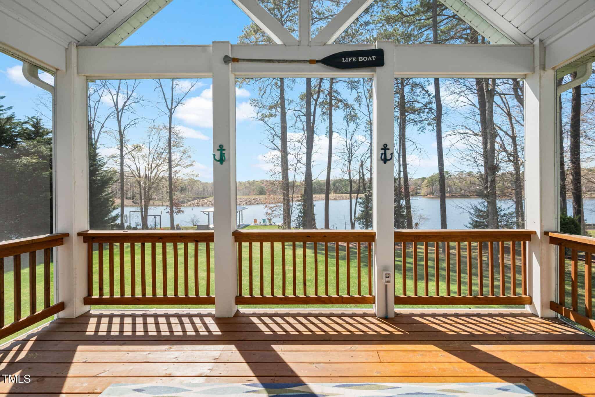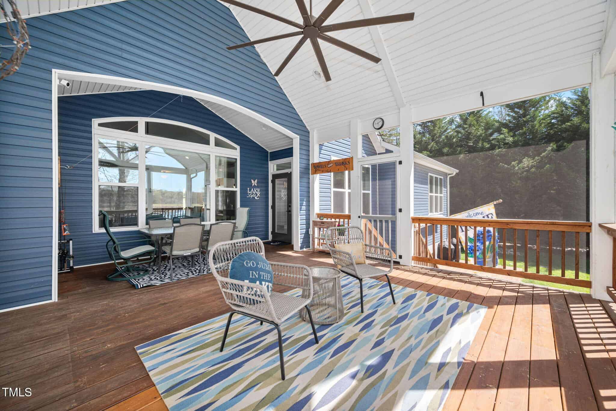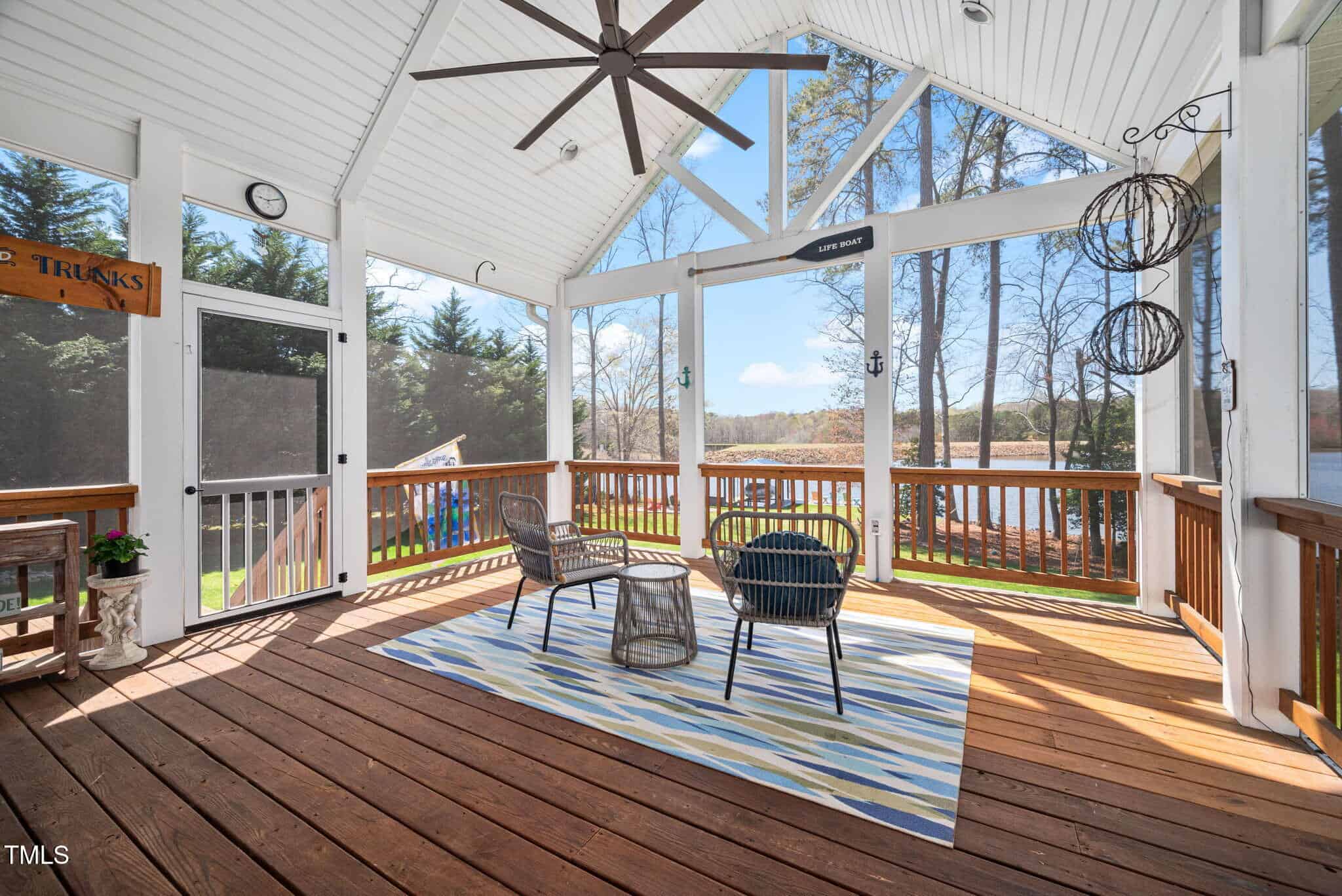 Inviting Outdoor Spaces: Cozy up by the outdoor fireplace or relax in the expansive, screened-in porch (installed in 2022) with panoramic views of the lake. Additional deck space with an automatic awning offers shade and comfort on sunny days.