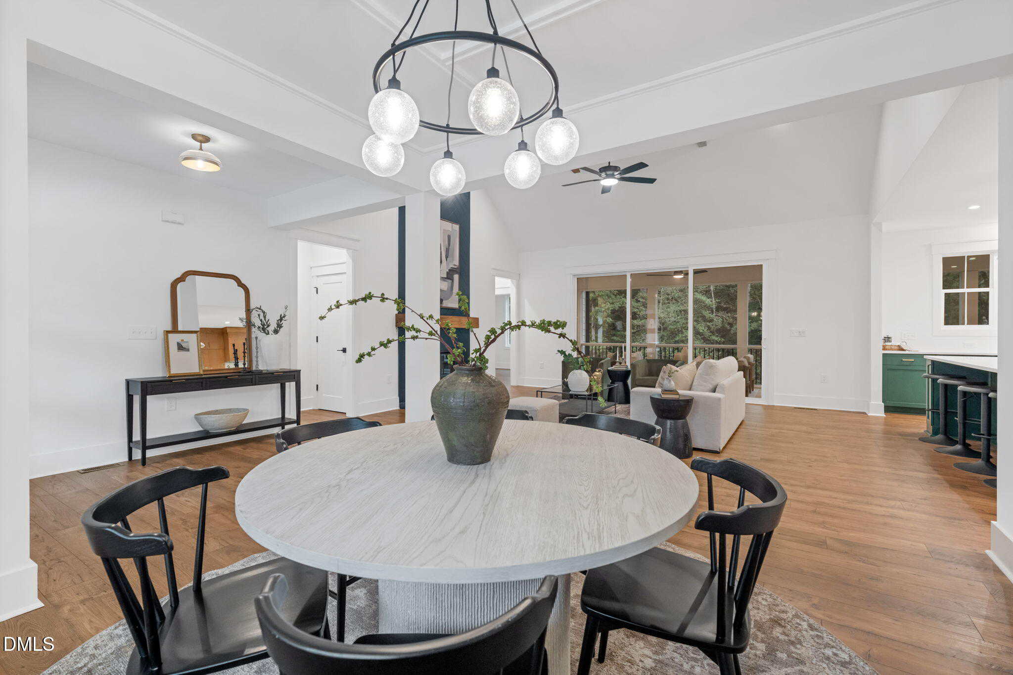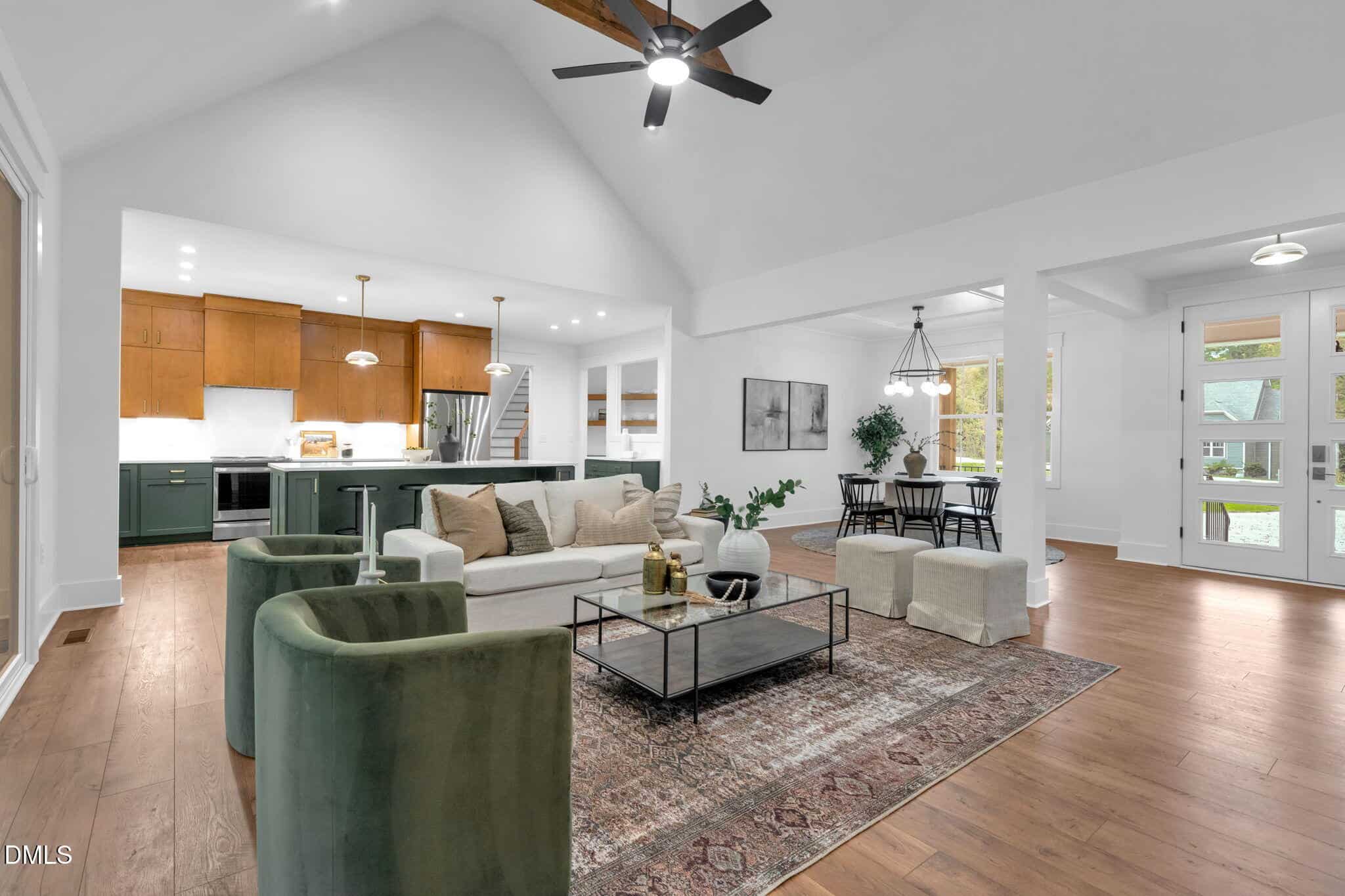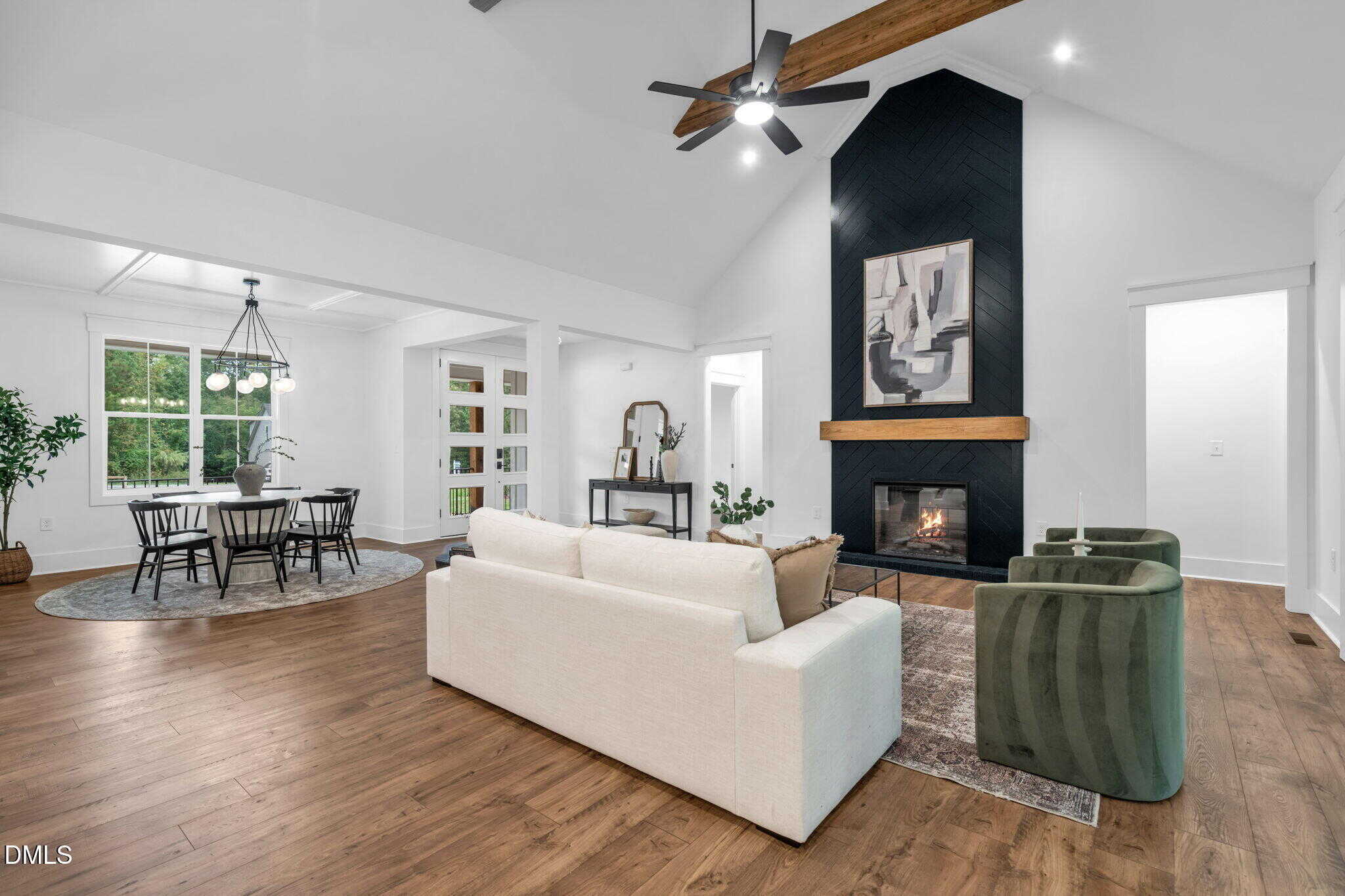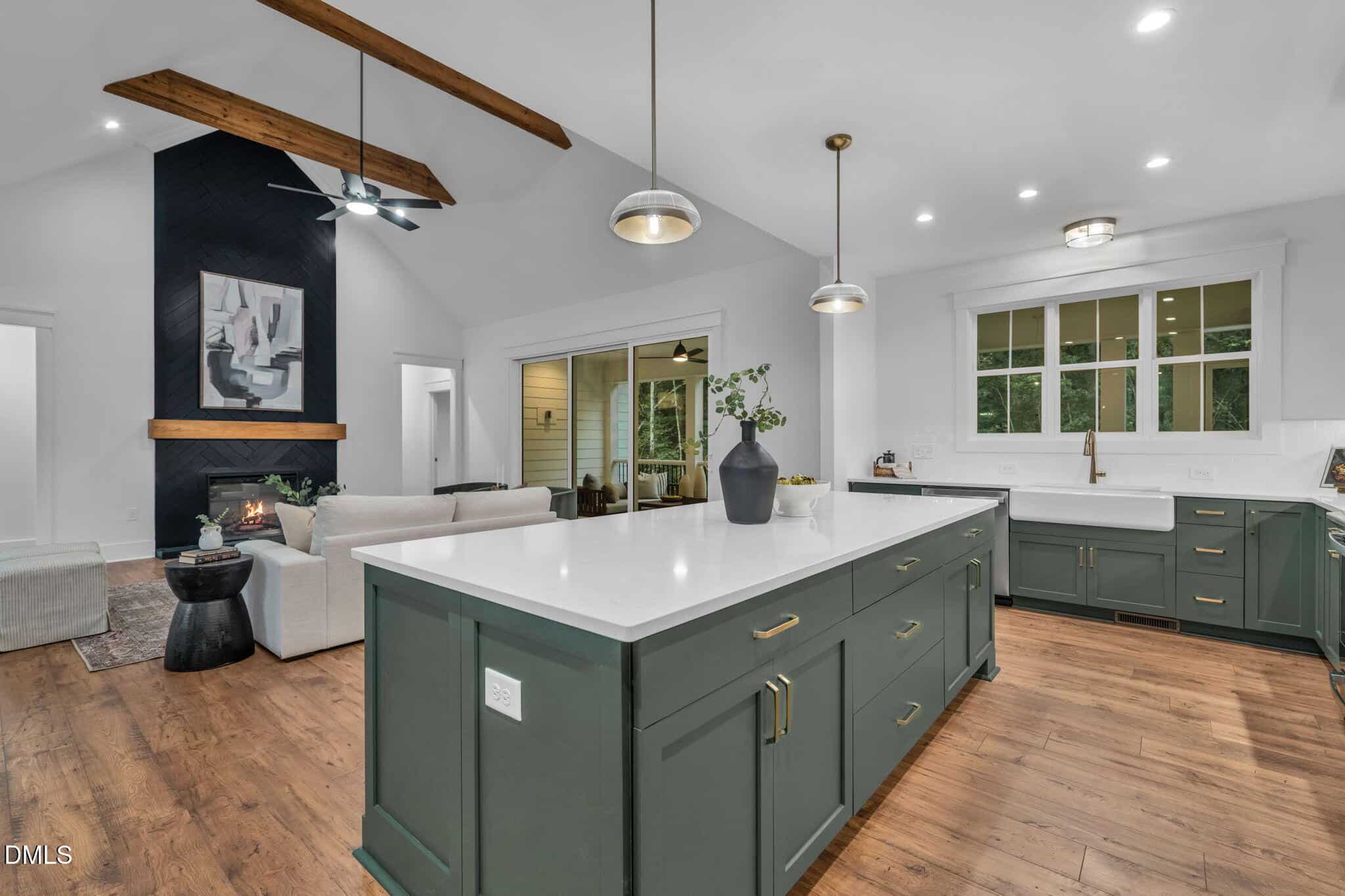 Inside, a vaulted family room with wood beam accents and a striking fireplace anchors the open-concept living space. The designer kitchen features a center island and a walk-through scullery for added prep and storage, while the formal dining room is ideal for entertaining.