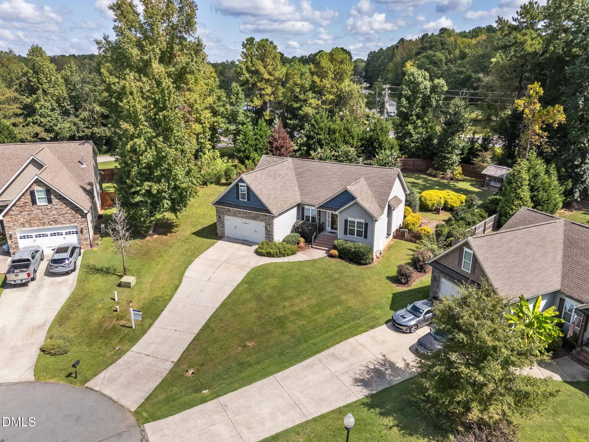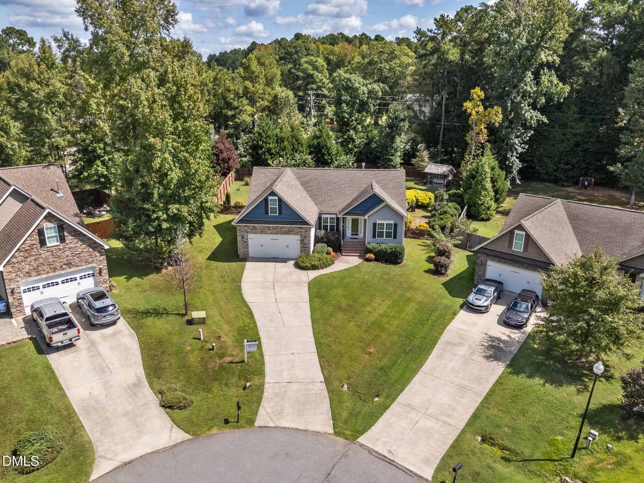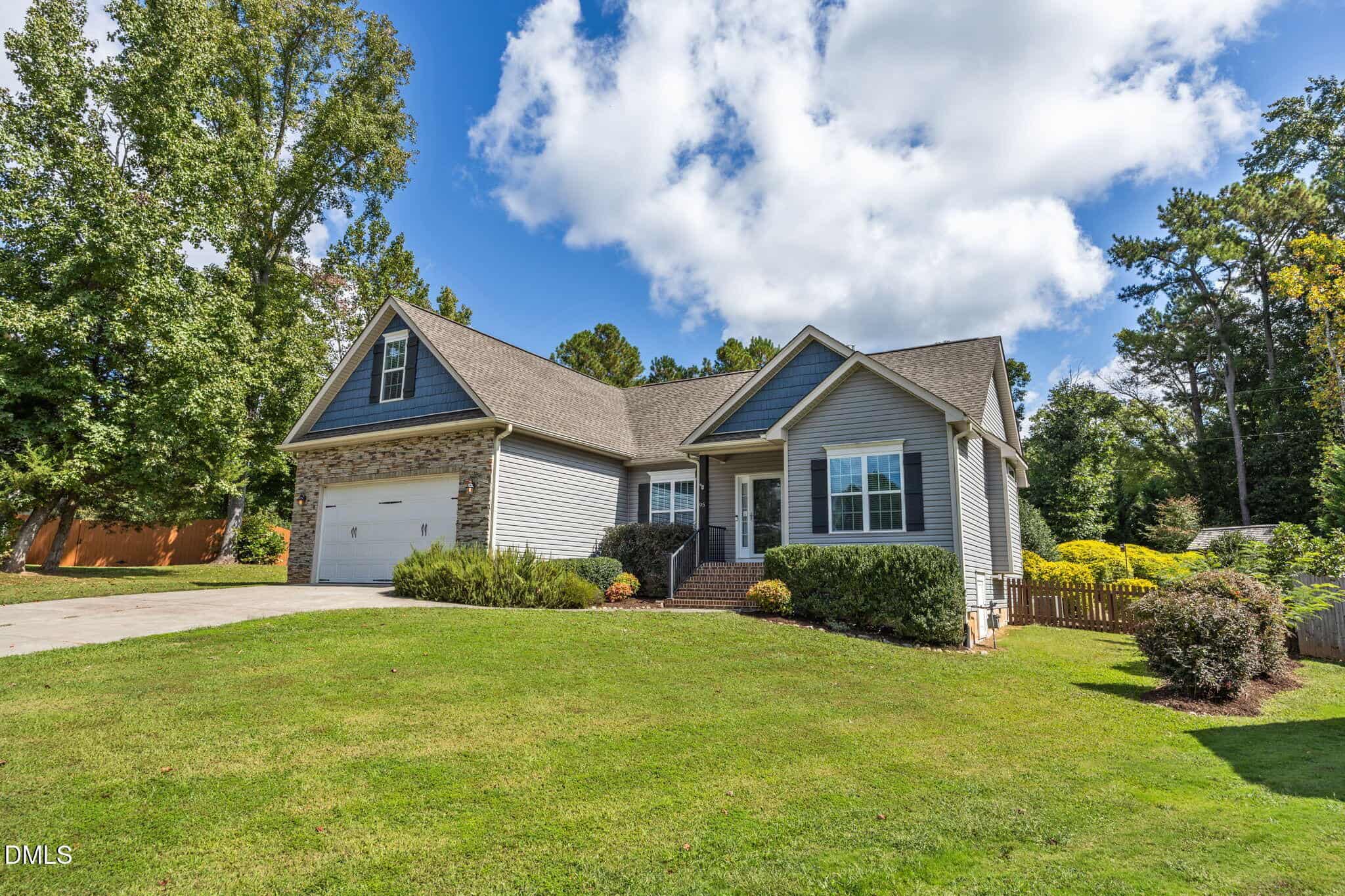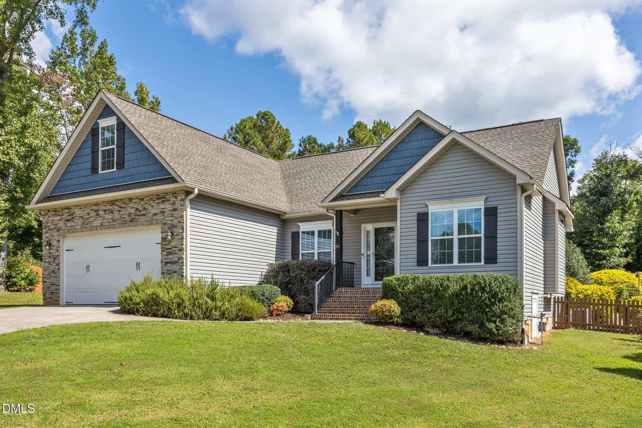 Welcome to this beautifully appointed 1.5-story home tucked away on over half an acre in a serene cul-de-sac setting. Impeccably maintained and thoughtfully landscaped, the property offers both privacy and curb appeal. Inside, the soaring vaulted ceilings, gleaming hardwood floors, and elegant gas fireplace create a welcoming centerpiece for the spacious living room. The kitchen is designed to impress with granite countertops, a custom tile backsplash, and premium stainless steel appliances, including a gas range and refrigerator. The primary suite provides a relaxing retreat with a walk-in closet and a spa-inspired tiled shower with a built-in bench. Additional highlights include ceramic tile floors in the bathrooms, a generous laundry room, and a two-car garage. Outside, enjoy the deck overlooking the lushly landscaped yard that includes a gardening shed. With the convenience of public water, natural gas, USDA eligibility, and easy access to Youngsville, Wake Forest, and RTP, this home perfectly blends everyday comfort with timeless style.