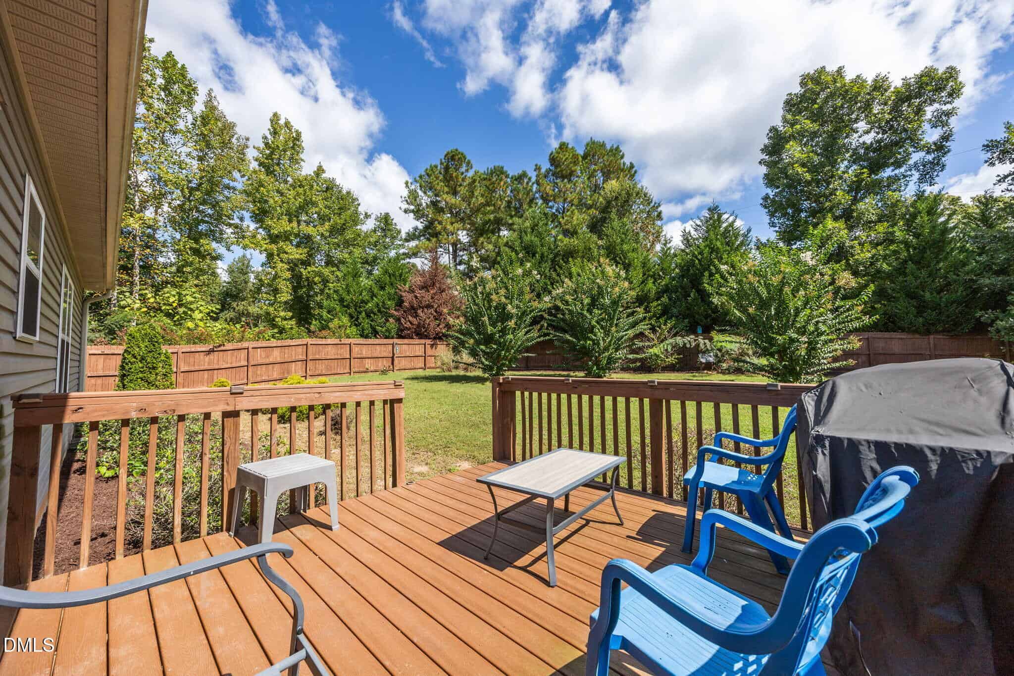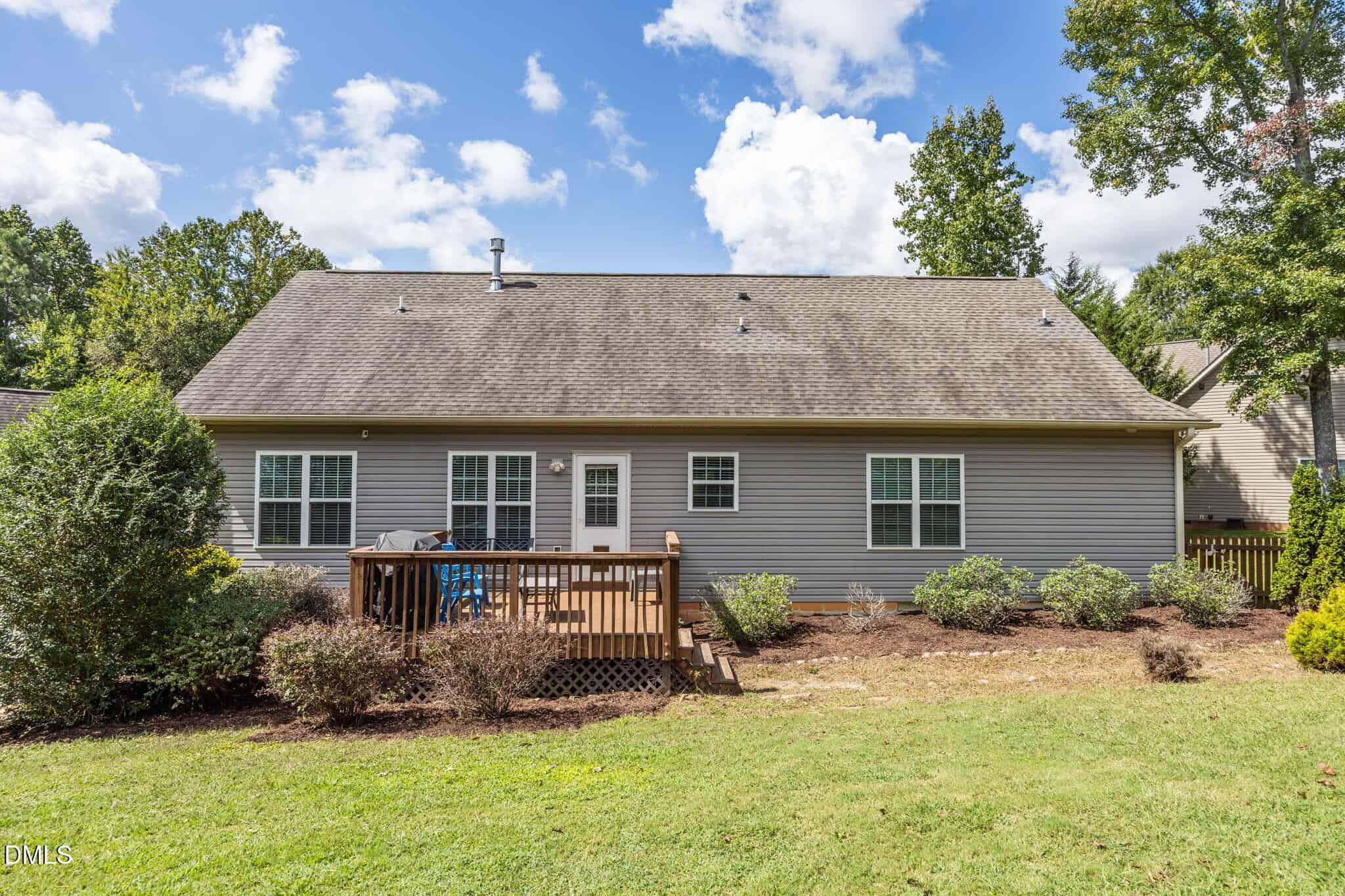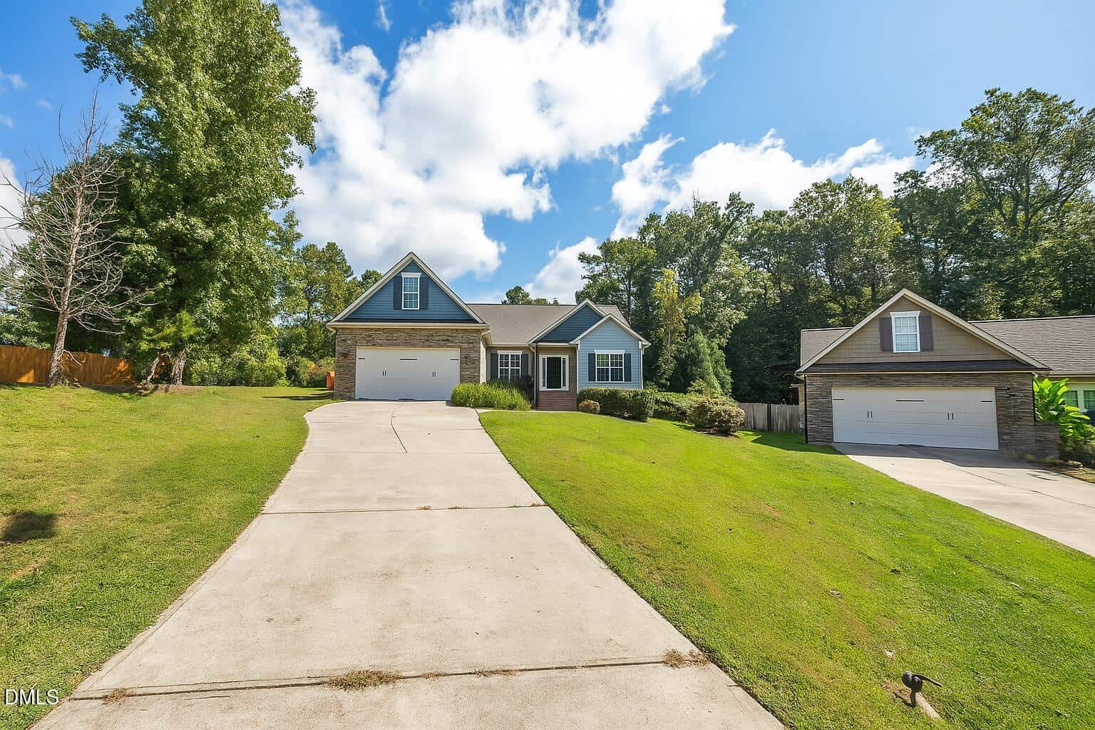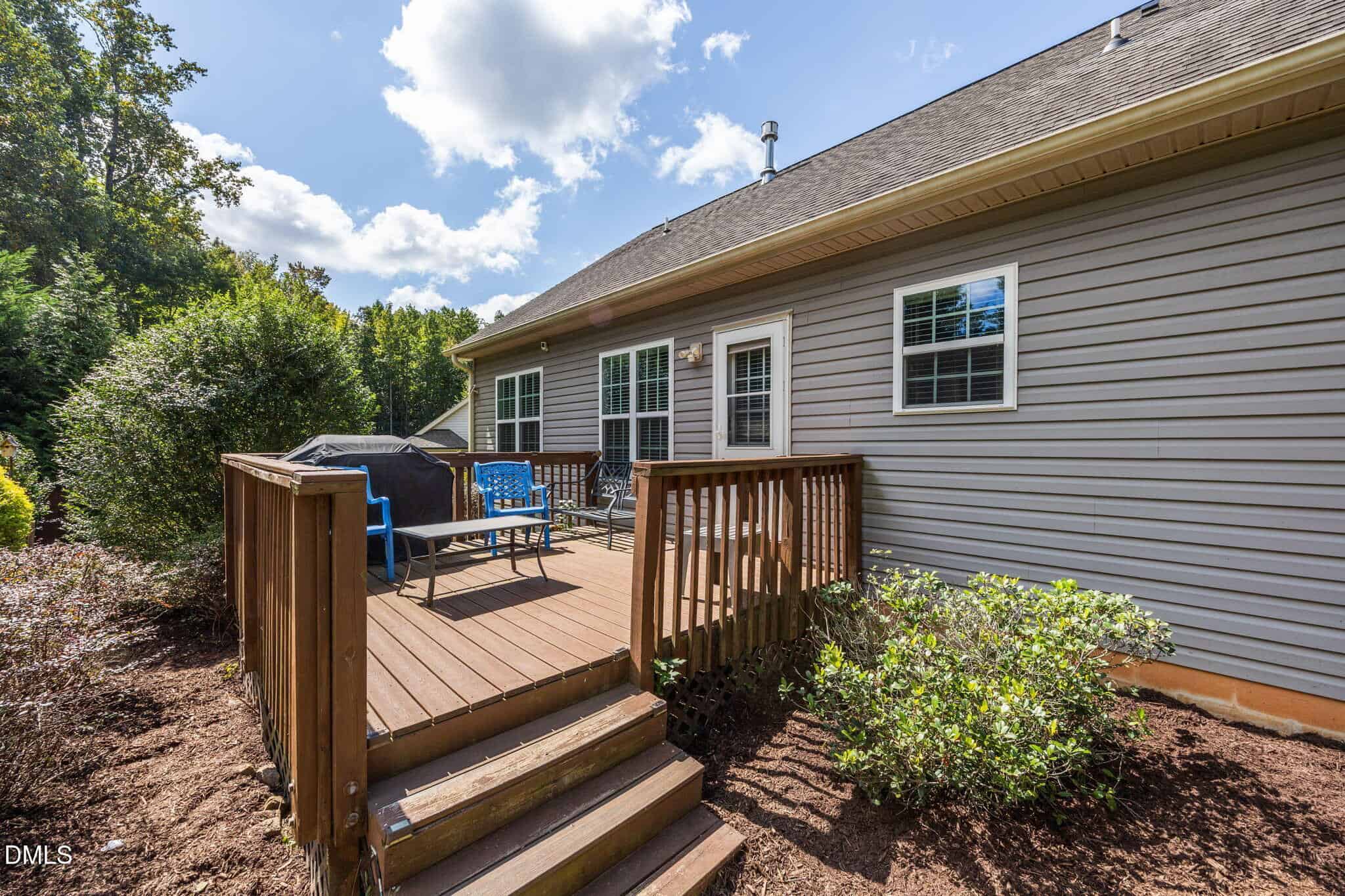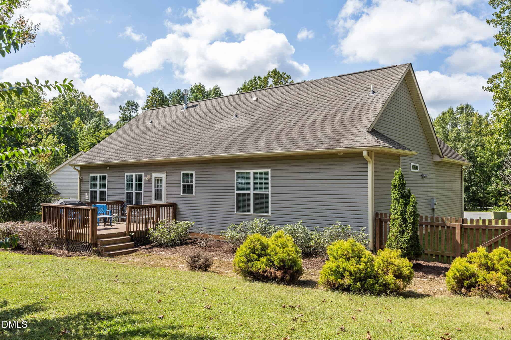 Welcome to this beautifully appointed 1.5-story home tucked away on over half an acre in a serene cul-de-sac setting. Impeccably maintained and thoughtfully landscaped, the property offers both privacy and curb appeal. Inside, the soaring vaulted ceilings, gleaming hardwood floors, and elegant gas fireplace create a welcoming centerpiece for the spacious living room. The kitchen is designed to impress with granite countertops, a custom tile backsplash, and premium stainless steel appliances, including a gas range and refrigerator. The primary suite provides a relaxing retreat with a walk-in closet and a spa-inspired tiled shower with a built-in bench. Additional highlights include ceramic tile floors in the bathrooms, a generous laundry room, and a two-car garage. Outside, enjoy the deck overlooking the lushly landscaped yard that includes a gardening shed. With the convenience of public water, natural gas, USDA eligibility, and easy access to Youngsville, Wake Forest, and RTP, this home perfectly blends everyday comfort with timeless style.