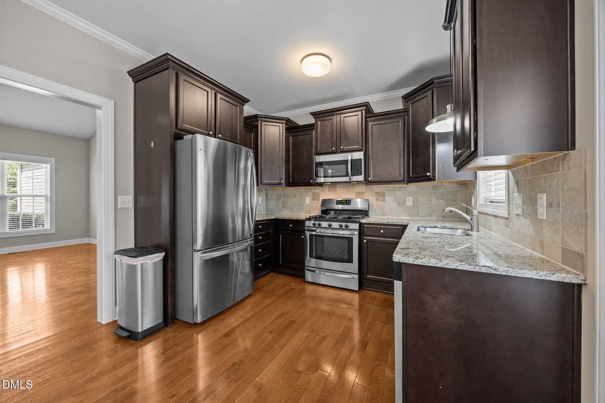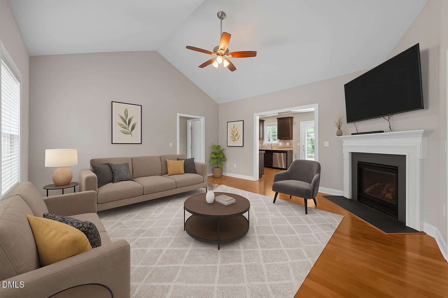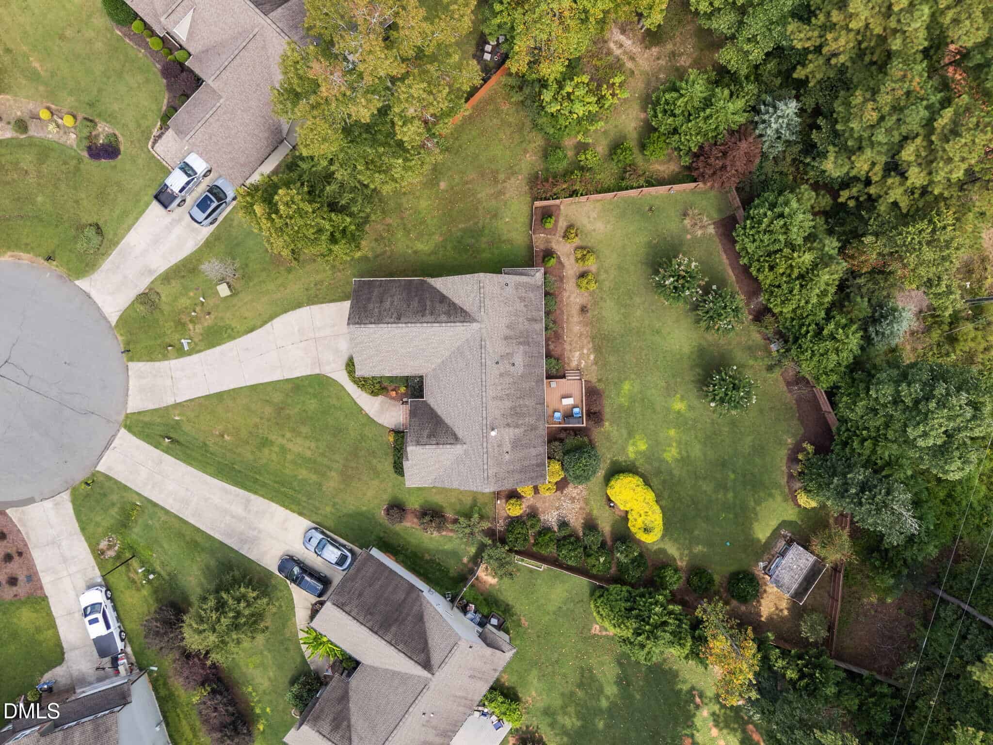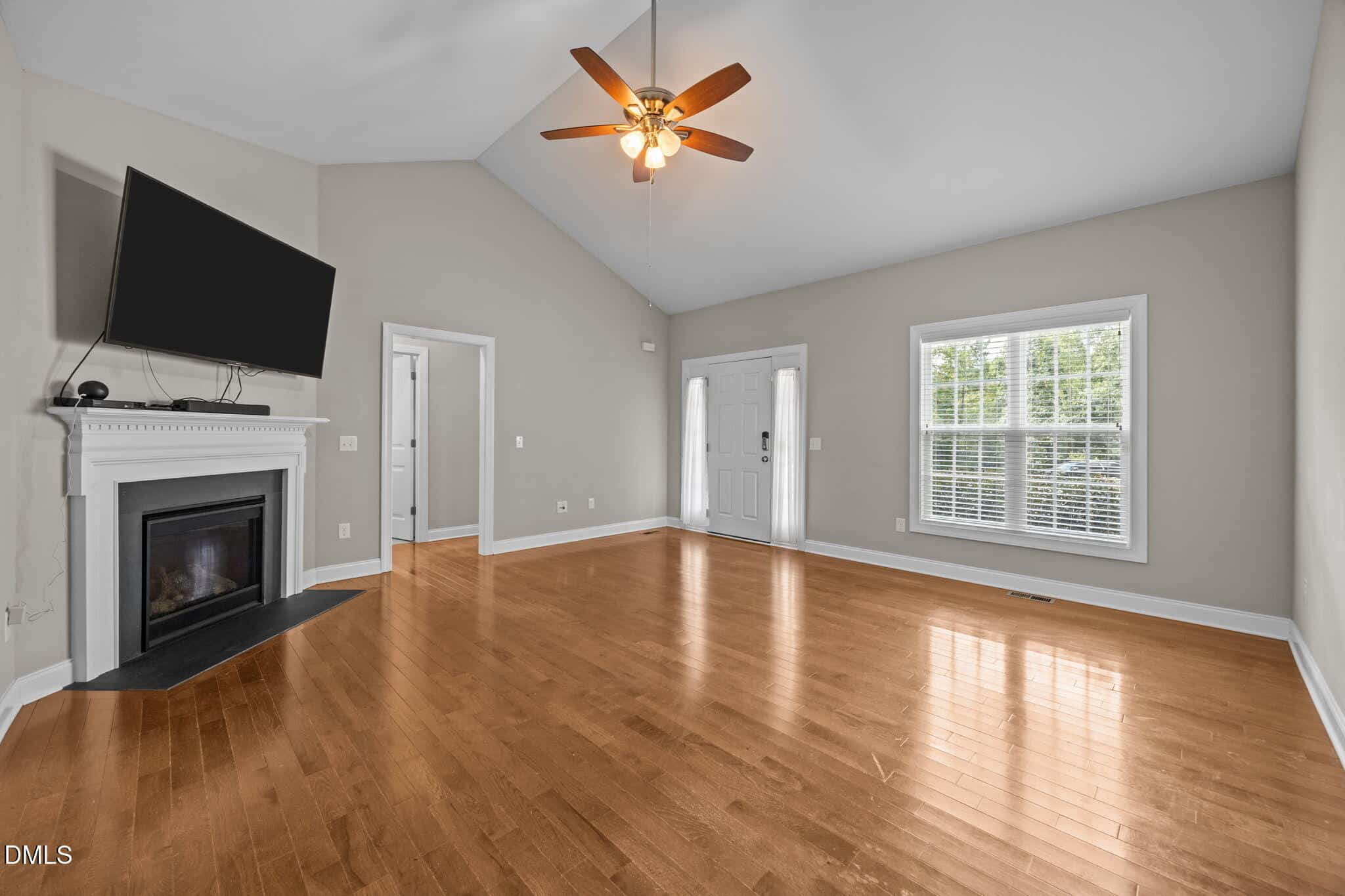 Welcome to this beautifully appointed 1.5-story home tucked away on over half an acre in a serene cul-de-sac setting. Impeccably maintained and thoughtfully landscaped, the property offers both privacy and curb appeal. Inside, the soaring vaulted ceilings, gleaming hardwood floors, and elegant gas fireplace create a welcoming centerpiece for the spacious living room. The kitchen is designed to impress with granite countertops, a custom tile backsplash, and premium stainless steel appliances, including a gas range and refrigerator. The primary suite provides a relaxing retreat with a walk-in closet and a spa-inspired tiled shower with a built-in bench. Additional highlights include ceramic tile floors in the bathrooms, a generous laundry room, and a two-car garage. Outside, enjoy the deck overlooking the lushly landscaped yard that includes a gardening shed. With the convenience of public water, natural gas, USDA eligibility, and easy access to Youngsville, Wake Forest, and RTP, this home perfectly blends everyday comfort with timeless style.