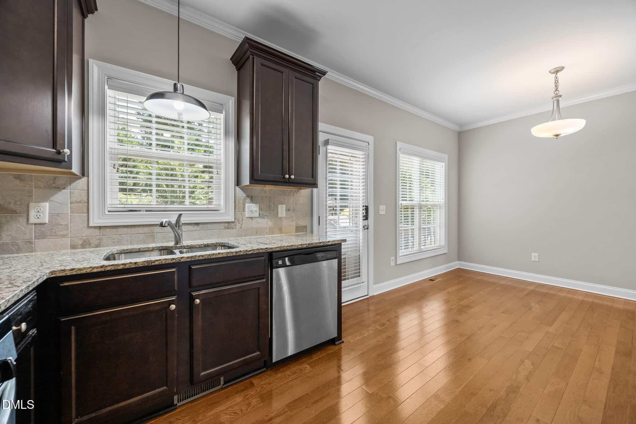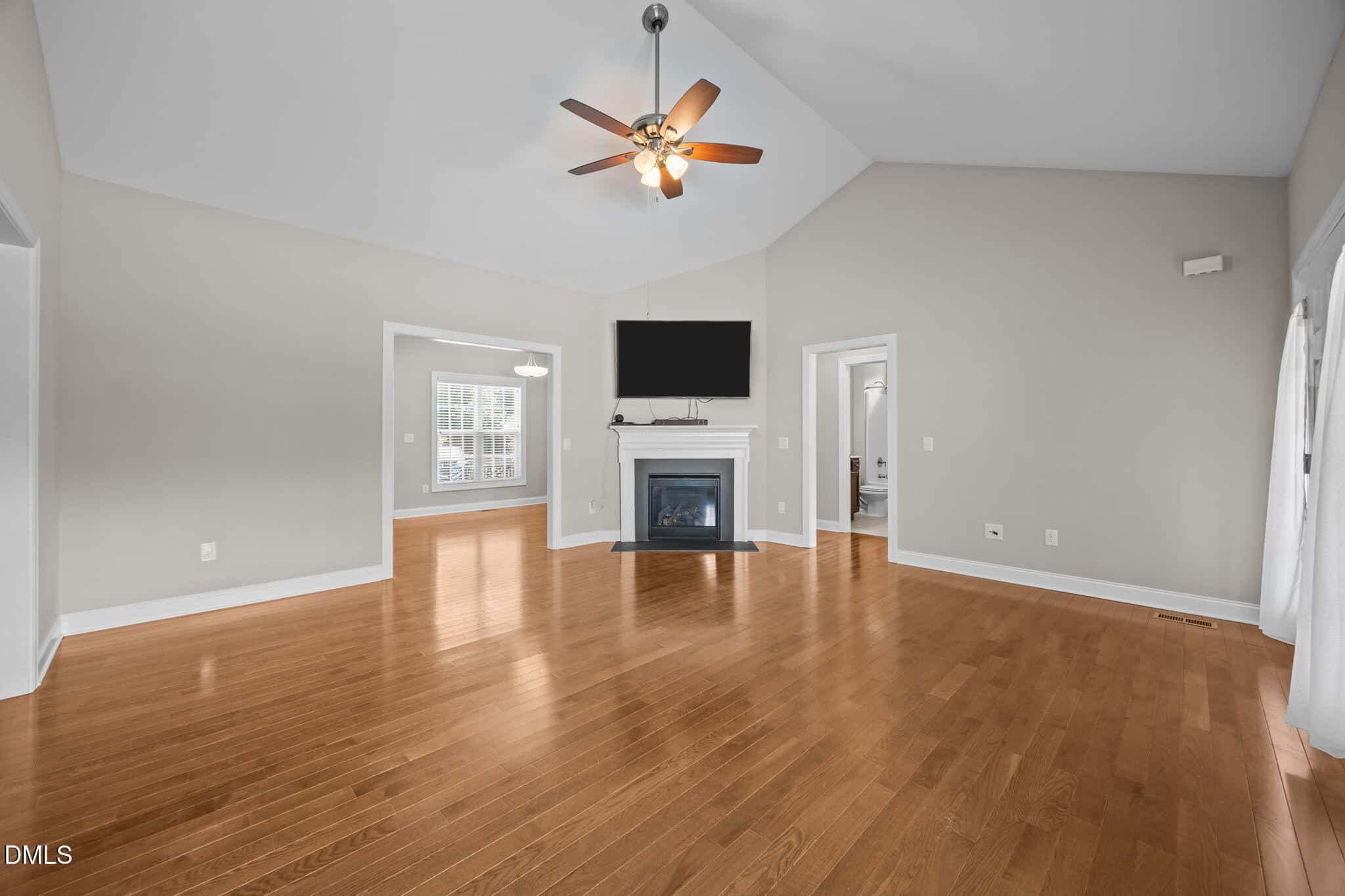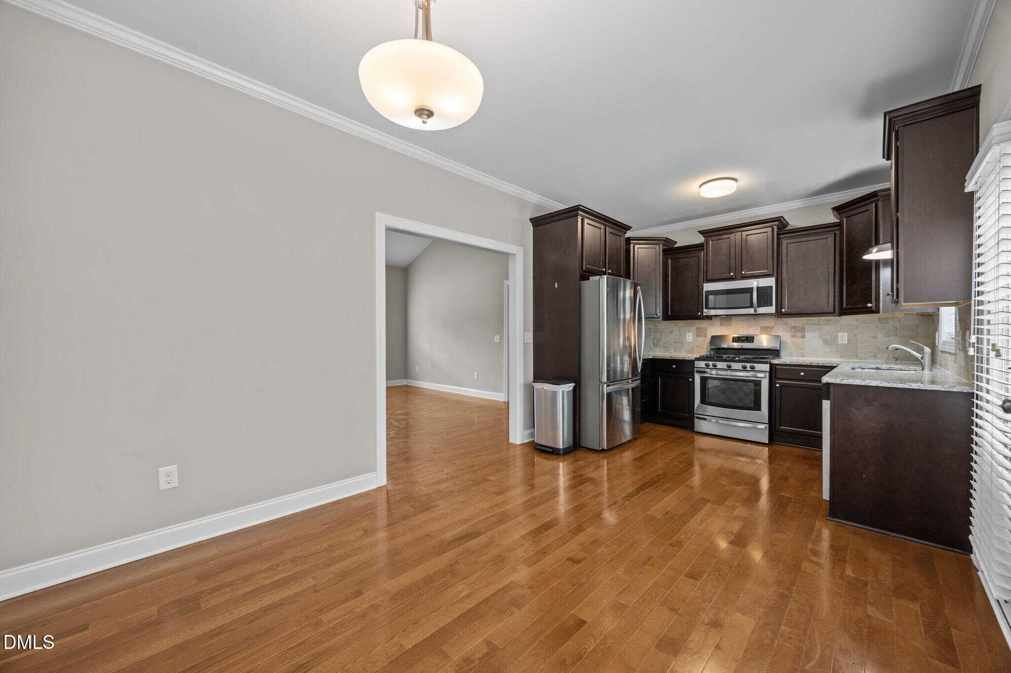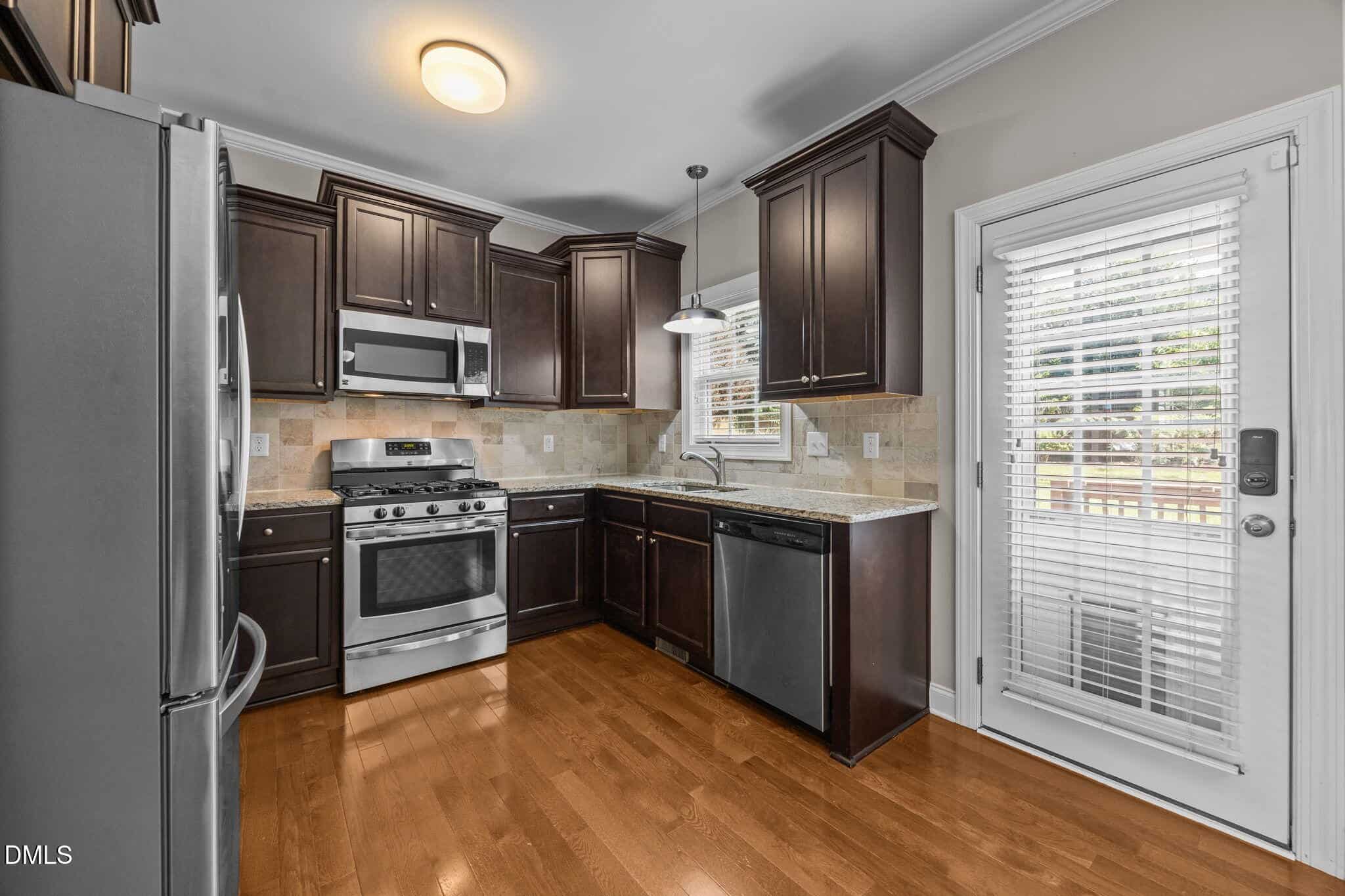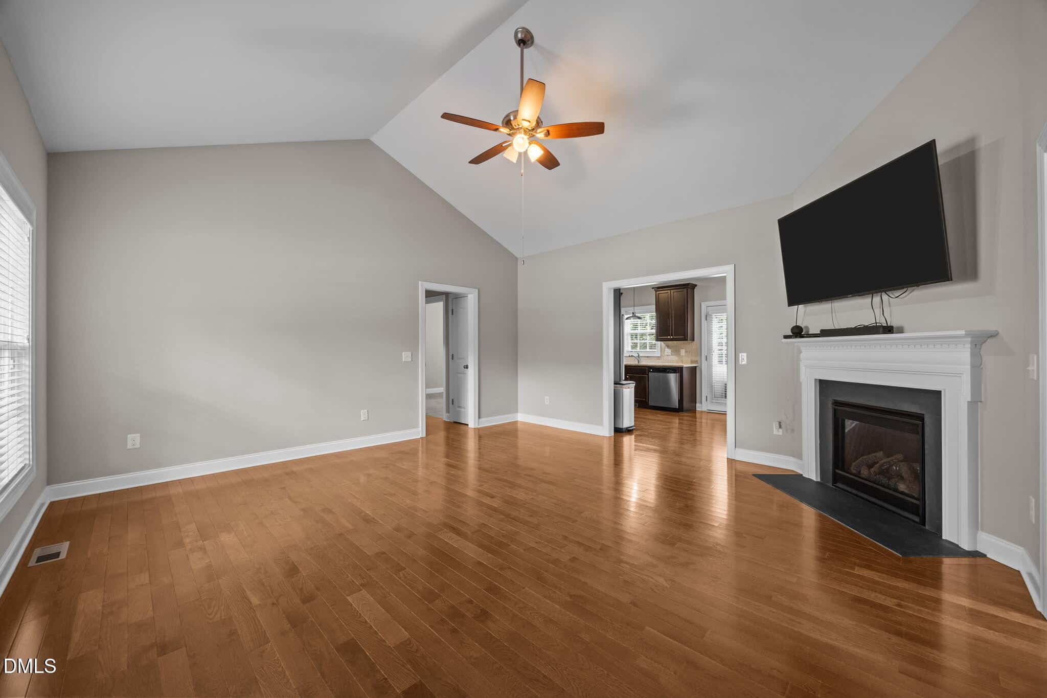 Welcome to this beautifully appointed 1.5-story home tucked away on over half an acre in a serene cul-de-sac setting. Impeccably maintained and thoughtfully landscaped, the property offers both privacy and curb appeal. Inside, the soaring vaulted ceilings, gleaming hardwood floors, and elegant gas fireplace create a welcoming centerpiece for the spacious living room. The kitchen is designed to impress with granite countertops, a custom tile backsplash, and premium stainless steel appliances, including a gas range and refrigerator. The primary suite provides a relaxing retreat with a walk-in closet and a spa-inspired tiled shower with a built-in bench. Additional highlights include ceramic tile floors in the bathrooms, a generous laundry room, and a two-car garage. Outside, enjoy the deck overlooking the lushly landscaped yard that includes a gardening shed. With the convenience of public water, natural gas, USDA eligibility, and easy access to Youngsville, Wake Forest, and RTP, this home perfectly blends everyday comfort with timeless style.